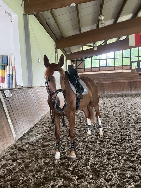 This beautiful chestnut mare, approximately 1.75 meters tall, impresses with her charm, expressiveness, and balanced temperament. She is very rideable and pleasant to ride in both show jumping and dressage. She particularly excels in the cross-country phase — demonstrating great scope, good technique, and the necessary caution. In handling, she is always well-behaved, uncomplicated, and friendly, making her an excellent choice for ambitious leisure riders or amateurs. Under saddle, she proves to be reliable and easy to manage — a mare that brings daily joy with her willingness to perform and her honest character. She also remains calm and fearless in the terrain and is absolutely straightforward and well-behaved when loading, trimming, or at the blacksmith.