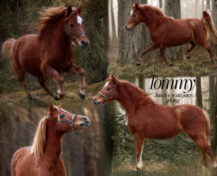Tommy is een lieve, rustige mini-gelding van 4 jaar oud en 91 cm hoog. Hij heeft ervaring in lead line en is begonnen met rijden in een kar. Hij heeft goede hoeven, een goede gezondheid en houdt van kinderen.