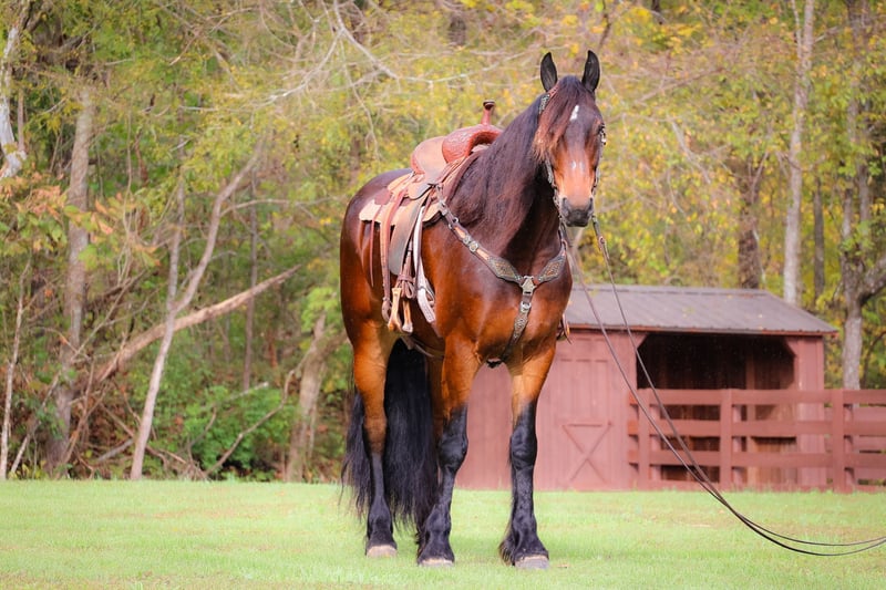 ONLINE AUCTION Place your bids at www.PlatinumEquineAuction.com Starting Bid $3500 Auction ends November 3rd, 2024 Need a new saddle? Check out White Rock Saddles on our website or Facebook! This is “JASPER”, a genuine, gentle, and honest BAY FRIESIAN MORGAN CROSSBRED GELDING that is broke to ride and drive. He is 6 years old and stands 16.1 hands tall. This gelding is extremely intelligent, well trained, civilized, and quiet. He stands to harness, hitch, tack, mount, and groom. He is peaceful to work around, stands for a bath, loads, bathes, and hauls with no fuss. This gelding has had dressage training and been ridden English and Western. He has done some ranch work and has been in the arena. He will move off of leg cues, stop nicely, back up, and lope off quietly. He has no buck and no hump. He will jog and lope circles, he catches his leads, and he is sure footed. This gelding will pick his way through rocky ground, cautiously maneuver down steep hills, and go through deep water with no hesitation. He has been on wagon trains, he will stand to a picket line overnight, he is traffic safe on the roads and not spooky. If you want an extremely handsome horse that is quiet, calm, and safe, don’t miss out on him. He is so personable, he aims to please, and his new owners will love his warm nature, calm demeanor, and intelligent expression. He is also a really nice mover. Located in Flemingsburg, KY. Call HH Horses Erin 304-238-4155. ONLINE AUCTION Place your bids at www.PlatinumEquineAuction.com Starting Bid $3500 Auction ends November 3rd, 2024 Need a new saddle? Check out White Rock Saddles on our website or Facebook!