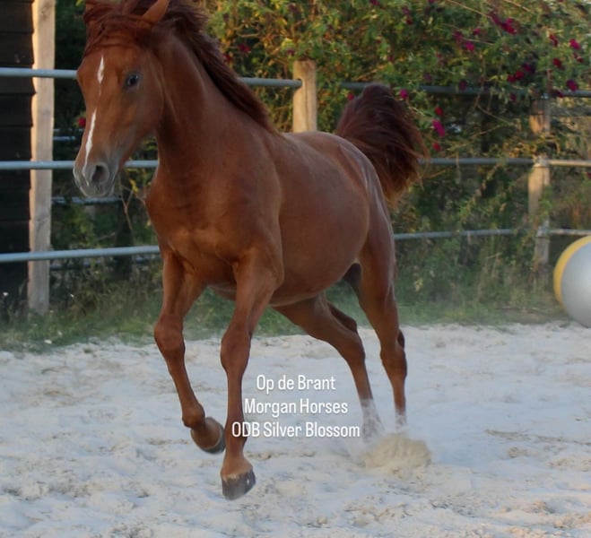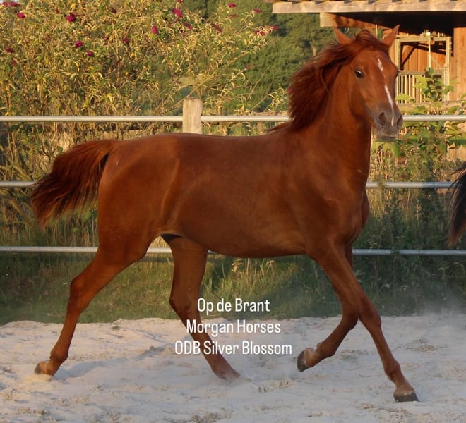 Elegant American Morgan Mare for Sale Discover the beauty and versatility of this stunning American Morgan mare, born in 2024. With her rich chestnut-red coat and graceful stature, she will stand at 1.54 meters, embodying both strength and elegance. Perfectly suited for Western riding disciplines, this mare offers a wonderful opportunity for riders seeking a reliable and spirited partner. Whether you're an experienced rider or an enthusiastic beginner, her friendly temperament and impressive presence make her an excellent choice. Don't miss the chance to welcome this exceptional mare into your stable! Blossom is very friendly and just like the morgan race stands out for, she loves humans. Her mom is the most cool mare in our breeding program. This young mare has both, character and stunning looks.