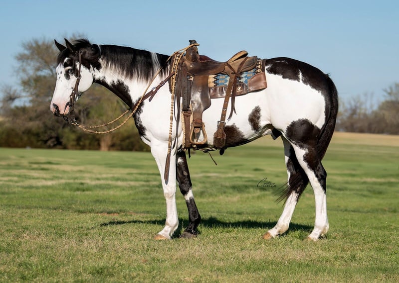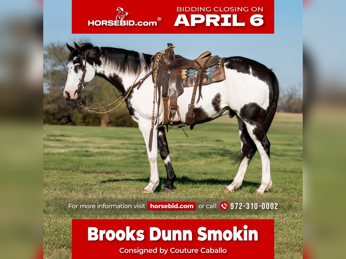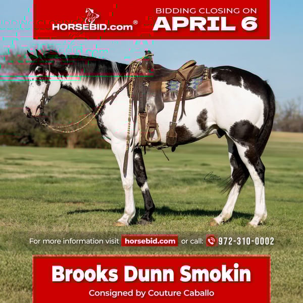 🌟𝑨𝒑𝒓𝒊𝒍 𝐀𝐋𝐋 𝐒𝐓𝐀𝐑 𝐋𝐈𝐍𝐄𝐔𝐏🌟 Happening now thru MONDAY | APRIL 6th - Available EXCLUSIVELY on HorseBid's website! For more details and to register visit: www.Horsebid.com CONSIGNOR CONTACT: Couture Caballo 972-310-0002 LOCATION: Fort Worth, TX BREED: APHA REGISTERED: Yes REGISTERED NAME: BROOKS DUNN SMOKIN COLOR: Black & White Overo HEIGHT: 15.3 AGE: 10 GENDER: Gelding Neon lights. Country nights. And one hell of a horse. If you’re looking for one that feels as good as your favorite country song sounds—Bandido is that ride. The kind you swing a leg over and immediately know… this is the one. A a spitting image of his sire, Brooks Dun N Black, Bandido carries the look, the presence, and a natural cadence that turns heads without trying. With two partial blue eyes, a bold overo pattern, and a strong, balanced 15.3 hand frame—he’s is unmissable. But what makes him special isn’t just what you see—it’s what you feel. The one you reach for at the end of a long day. The one that makes you slow down, take a breath, and actually enjoy the ride. He’s trained without being complicated. Safe without being dull. Fun without being chaotic. Just slip on your boots... & he'll take it from there. You won’t find many out there that operate as smooth as this guy. With experience in both English and western disciplines, Bandido is built for effortless transitions, is easy going, and is a point n shoot style ride. Whether you’re loading him up to trek out on the trail, cruise into downtown for an evening on the town, or step into the show pen in an equitation or ranch riding class — this gelding will meet you where you’re at, and make every ride a blast! This horse is both delicate with the little ones (even though he towers over them), but is also the type of gelding a horseman can enjoy! Bandido is proven reliable on and off the ranch with no BS! Ride him in a halter, or a port bit he packs a consistent, comfy, feel, true one hand neck rein, and is great with or without a buddy… because let’s face it— there is nothing worse than a horse that paws at the trailer, or is constantly looking for his friends. This classic made paint gelding travels steady underneath you, has a rocking horse lope, short jog, and a ground covering extended trot. Stylish. Safe. And just the right kind of fun. Take a deep breath from the stresses of the day, slip on your boots, and enjoy the kind of ride that reminds you why you started in the first place… Your new trusted compadre, Bandido!