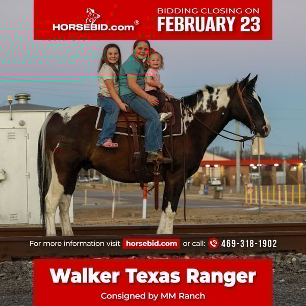💎 𝐓𝐇𝐄 𝓓𝓲𝓪𝓶𝓸𝓷𝓭 𝐒𝐇𝐎𝐖𝐂𝐀𝐒𝐄 💎 Happening now thru MONDAY | FEBRUARY 23rd - Available EXCLUSIVELY on HorseBid's website! For more details and to register visit: www.Horsebid.com CONSIGNOR CONTACT: MM Ranch 469-318-1902 LOCATION: Forney, TX BREED: APHA REGISTERED: No REGISTERED NAME: Walker Texas Ranger COLOR: Black/White Paint HEIGHT: 15 AGE: 12 GENDER: Gelding This is Walker Texas Ranger. If you know you know. It was one of my all time favorite shows growing up. I can still sing the theme song till this day. It’s funny how he got that name. He came to us from a park ranger that had been riding him for work. So we would say go catch the park ranger horse. Which turned into Texas Ranger. Then Walker Texas Ranger. And the name just stuck. Which he is a bada** like Walker Texas Ranger so he is deserving of the name. Walker is a 12 yrs old black and white paint gelding. Standing 15 hands tall. He is a wide as he is tall. Stout made. Lots of bone. Great confirmation. If you are looking for a safe, reliable, and truly versatile gelding, look no further — Walker is the one. He makes a statement of being a bombproof safe reliable family horse. Gentle, quiet, and dependable in every way, he is the type of horse that is hard to come by and even harder to let go of. Walker has been ridden both English and Western, making him suitable for a wide variety of riders and disciplines. Whether you want to enjoy a relaxing trail ride or ride in the arena! He has the mindset to adapt to whatever you ask of him. Walker has been roped on outside the arena some, and handles the job with ease and willingness. He has worked in the pens at the grow yards moving cattle and his easy side pass makes it so easy to open and close gates off of. He is the perfect candidate for working and checking your cows out on the ranch! He’s soft and supple in the sides. He is the same horse every time you saddle him. He rides off quietly, neck reins, and stays light in the bridle. He will walk, trot, and lope on a loose rein, and steps up willingly into a lope from a walk when asked without ever being hot or hard to handle. He has a silky smooth little soft lope. He is easy and fun to ride. He is a very pretty mover as well. He would make an excellent course country jumping horse. He is a natural. He took right to it with very little effort. You show him something once and he remembers it. Very easy to get to do new things on. His abilities are ended less. So ride him English or Western. You can’t go wrong. Out on the trails, he is an expert. He has had so much experience and been rode many miles. He was used for 3 years in the forest being used as a park rangers horse. He dang sure has been there done that type. He is steady and sure-footed. He crosses water, handles rough terrain, and doesn’t spook at the unexpected. He has even had a gun shot off and around him. Whether you ride alone or in a group, he stays calm, making him an ideal choice for anyone who values safety and confidence in their horse. He has the kind of mind and disposition that makes him suitable for any rider. Yes even first time riders. He is kind and forgiving for someone learning, yet broke and responsive enough for an experienced hand to enjoy. He is a standout gelding you can trust in any situation. It’s hard to find one this BROKE, and GENTLE! Plus has the color!! Bonus about him he is a super easy keeper. Requires no maintenance of any kind. He can go bare foot or put shoes on him. You can stall him or turn him out. Doesn’t matter to him. He is easy. PLUS he sells 100% sounds with no issues. He did have a pre vet evaluation done included in the pictures. If you have anymore questions about him feel free to call. We would love to visit with you about him. We can help you arrange shipping anywhere. He is up to date on all vaccinations, worming, had his teeth checked, feet. He is ready to go to his new home.