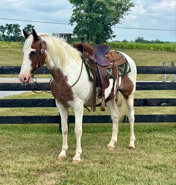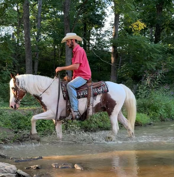 ONLINE AUCTION Place your bids at www.PlatinumEquineAuction.com Starting Bid $3500 Auction ends September 8th, 2024 Need a new saddle? Check out White Rock Saddles on our website or Facebook! Fritz is an eye catching bay roan and white pinto gelding. He is 10 years old and stands 14.3 hands. He is a very stocky and stout made gelding! If you’re looking for a laid back gelding to hit the trails with or to do some light arena work, Fritz is your man! He rides out alone or with a group. He is a very experienced trail riding horse. He will step quietly over logs, he drops down hills easily, and will walk over a ditch like a gentleman. Fritz is not a spooky gelding. He is not frazzled easily, even if younger or less experienced horses get worried over something. He stands nicely when it’s time to take a snack break on the trail. He walks, jogs, and lopes well. Fritz stands grooming, saddling, and mounting. He trailers well and handles new places with grace. Fritz is traffic safe. He is quiet and gentle enough for all levels of riders! If you just want to jump on and have fun bareback with a halter and lead rope, he is comfortable to do that too. In addition to riding, Fritz has been driven to the wagon as a team. He will stand to harness and hook with no issues! His quiet demeanor is hard to find, and that’s what we love the most about him! For more information, please call Sammi Waugh 704-798-5497. Located in Brooksville, KY. ONLINE AUCTION Place your bids at www.PlatinumEquineAuction.com Starting Bid $3500 Auction ends September 8th, 2024 Need a new saddle? Check out White Rock Saddles on our website or Facebook!