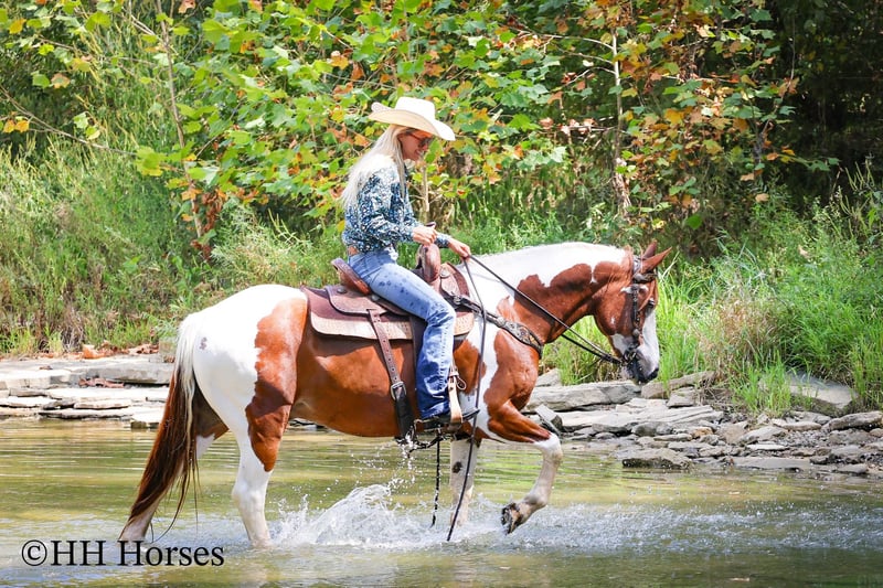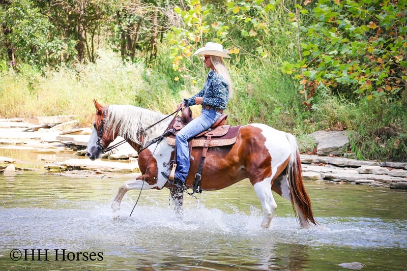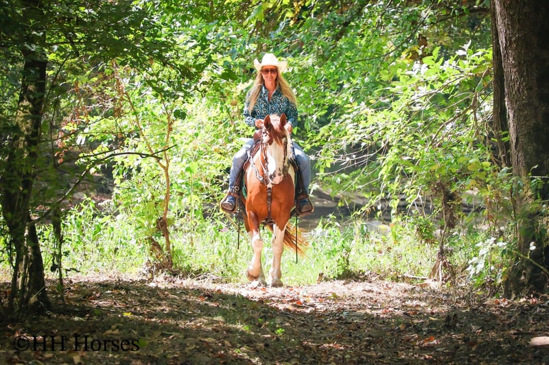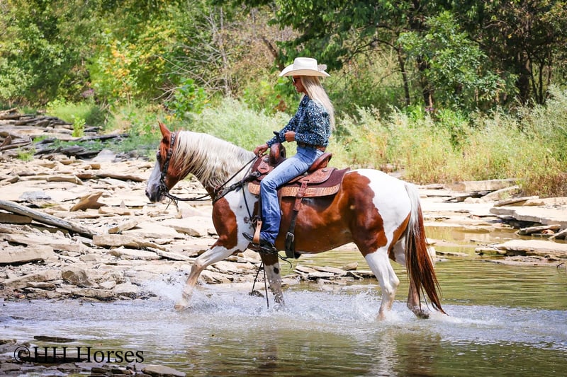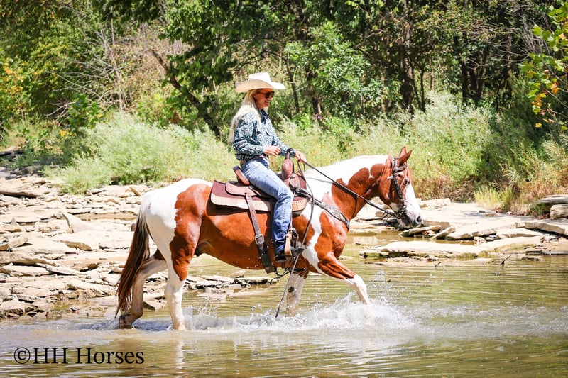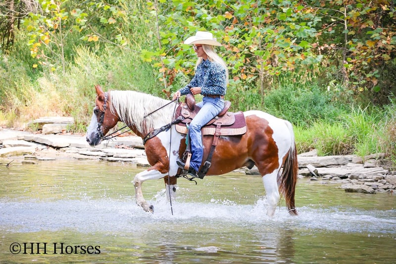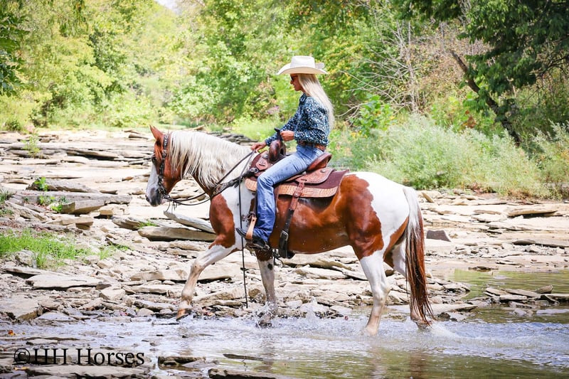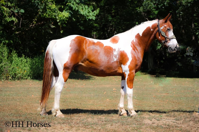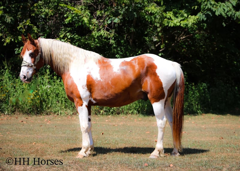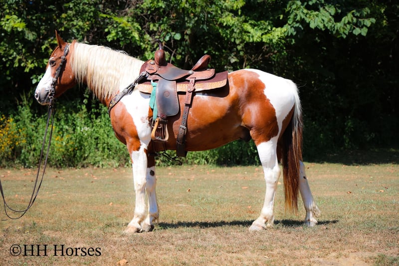 ONLINE AUCTION Place your bids at www.PlatinumEquineAuction.com Starting Bid $3500 Auction ends September 14th, 2025 Need a new saddle? Check out White Rock Saddles on our website or Facebook This is “TECUMSEH”, a loud colored, flashy, sorrel and white TOBIANO PAINT GYPSY CROSSBRED GELDING that has been used for trail riding, arena work, and ranch work. He is 3/4 Paint and 1/4 Gyspy. This gelding is a superb trail mount, he is traffic safe, and not spooky. He is stout made and stands 14.3 hands tall. He is 14 years old. He is very fun to ride, he has a smooth easy to sit jog and a collected canter. He stops easily on whoa, backs up, and walks out nicely on the trails. He will cross the water, go through the woods, and take his time up and down steep embankments. He has been used in the pastures to check cattle and fences. He rides out alone and goes willingly anywhere you point him. He is attractive, well built, has a head full of sense, and he is gentle to work around. He stands tied, loads, bathes, and hauls with no fuss. He is a cool horse with lots of style. Located in Flemingsburg, KY. Contact Erin with HH Horses 304-238-4155 with any questions or to make a Buy It Now Offer. ONLINE AUCTION Place your bids at www.PlatinumEquineAuction.com Starting Bid $3500 Auction ends September 14th, 2025 Need a new saddle? Check out White Rock Saddles on our website or Facebook