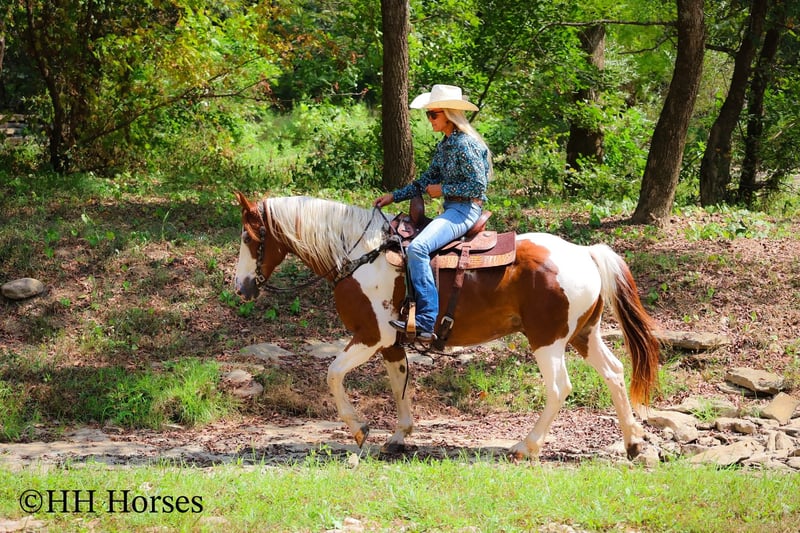 ONLINE AUCTION Place your bids at www.PlatinumEquineAuction.com Starting Bid $3500 Auction ends September 14th, 2025 Need a new saddle? Check out White Rock Saddles on our website or Facebook This is “TECUMSEH”, a loud colored, flashy, sorrel and white TOBIANO PAINT GYPSY CROSSBRED GELDING that has been used for trail riding, arena work, and ranch work. He is 3/4 Paint and 1/4 Gyspy. This gelding is a superb trail mount, he is traffic safe, and not spooky. He is stout made and stands 14.3 hands tall. He is 14 years old. He is very fun to ride, he has a smooth easy to sit jog and a collected canter. He stops easily on whoa, backs up, and walks out nicely on the trails. He will cross the water, go through the woods, and take his time up and down steep embankments. He has been used in the pastures to check cattle and fences. He rides out alone and goes willingly anywhere you point him. He is attractive, well built, has a head full of sense, and he is gentle to work around. He stands tied, loads, bathes, and hauls with no fuss. He is a cool horse with lots of style. Located in Flemingsburg, KY. Contact Erin with HH Horses 304-238-4155 with any questions or to make a Buy It Now Offer. ONLINE AUCTION Place your bids at www.PlatinumEquineAuction.com Starting Bid $3500 Auction ends September 14th, 2025 Need a new saddle? Check out White Rock Saddles on our website or Facebook