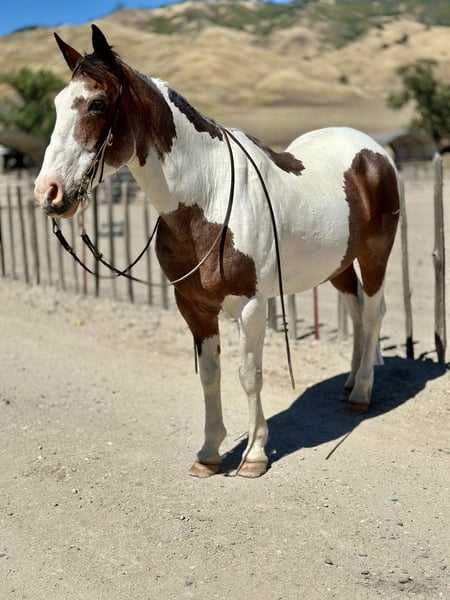 ONLINE AUCTION Place your bids at www.PlatinumEquineAuction.com Starting Bid $3500 Auction ends June 16th, 2024 Need a new saddle? Check out White Rock Saddles on our website or Facebook! Meet potato he is a 13 year old roan paint standing just under 15HH. This horse is as solid, and honest as they come. He is the definition of a baby sitter. He has done just about everything you can do horseback. Ranch, trail, rope. He is an absolute solid ranch gelding. You can tie off on him in the pasture doctoring cattle, gather the toughest country and is great in the branding pen. Potato is one you can trust with the most timid beginner riders, knowing he will take care of whoever is on his back. Potato is superb out on the trail he will go anywhere and you can drop your reins and he will follow any trail. This horse is safe for grandmas, husbands and the most precious of cargo. This is a horse the entire family can enjoy. When you look up bombproof in the dictionary there’s a picture of Potato! He will be the most trustworthy, knowledgeable horse that has a been there done that attitude. Potato has also been roped on out of the box and can head and heel. He is the safest horse on busy streets and is used to all types of machinery. Potato is great in the arena he rides nice and correct neck reins picks up his leads and is honest as the day is long. There isn’t anything you can’t do on this horse. Potato is not scared of the flag flapping around him. The tarp blowing in his face or the ball bouncing on his back. He has been in some trail courses and does great. Potato has been on overnight camping trips and will be absolutely one you can depend on to be safe and reliable mount for anyone. This horse has so much experience to share with his rider he is remarkable and worth his weight in gold! Potato is eager to please and pokes along with the most inexperienced riders or picks up the pace for the more advanced. Potato is easy to catch, tack up and groom. He is great for the farrier loves baths and the first to greet you at the gait he’s like a big puppy. He is the most laid back horse, he is truly amazing. He has zero issues and is maintenance free. He stalls or is great out in a pasture setting as well. Nothing and I mean nothing, will bother this horse. He has never blinked an eye at anything and never will! He is located in Bitterwater, CA. For more info please call or text Cheyenne Rey 831-537-8746. ONLINE AUCTION Place your bids at www.PlatinumEquineAuction.com Starting Bid $3500 Auction ends June 16th, 2024 Need a new saddle? Check out White Rock Saddles on our website or Facebook!