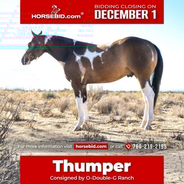 ⚜️ 𝓽𝓱𝓮 𝐇𝐨𝐫𝐬𝐞𝐦𝐚𝐧'𝐬 𝓢𝓱𝓸𝔀𝓬𝓪𝓼𝓮⚜️ Happening now thru MONDAY | DECEMBER 1st - Available EXCLUSIVELY on HorseBid's website! For more details and to register visit: www.Horsebid.com CONSIGNOR CONTACT: O-Double-G Ranch 760-219-2195 LOCATION: Apple Valley, CA BREED: APHA, PtHA, ATHA REGISTERED: Yes REGISTERED NAME: IMASENSATIONALINVITE COLOR: Buckskin Tobiano HEIGHT: 15 AGE: 2 GENDER: Gelding ImaSensationalInvite (aka Thumper) (John Simon x Sensational Array) 2023 APHA/ABRA/PtHA/ATHA/NSBA Buckskin Tobiano Gelding Triple Registered APHA, PtHA, ATHA 7 Panel n/n UTD on worming PPE at buyers expense Located in Southern California - Can recommend transports Ima SensationalInvite Career Overview: 2x Reserve World Champion Congress Champion Congress Reserve Champion Multiple Top 5 and Top 10s at World Shows Reserve NSBA Champion at the ABRA World Show ABRA Reserve Honor Roll Buckskin Bred Stallion Point & Money Earner Breeders Trust Enrolled This gelding has been exposed to and does all of the following: Bathes Clips Ties(cross, patience pole, wall) Hobbles Blankets Fly Mask Slinky Lifts all four feet, hot shod on the front, bare on the back Under saddle since April Lungeline Driving Reins Ridden in Snaffle Bit and Bozal Ridden Bareback with Bozal Rides out alone or with other horses Nice slow show trot/jog Moves off of leg pressure well Soft in the mouth Will lope good round circles Carries head low No spook (will walk by, over or through anything) Loads and trailers quiet Turned out with another gelding Hot walker Cattle Plays Ball He has been ponied from another horse
