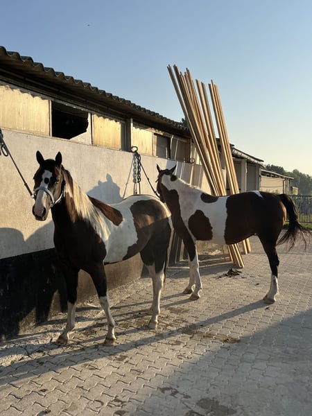 For sale is the 2023-born Paint Horse gelding BUTTONS JIMBEAM (out of DD CHAMPAGNE BUTTON x CHARMED WITCH JOSIE), affectionately known as "JOE." Joe has been in my possession since he was one year old, and I can honestly say he is the most relaxed and friendly young horse I have ever met. He came to me through a roundabout route and was initially only supposed to stay temporarily. Later, I decided to keep him until he is three years old to find him a suitable home. I am only offering this handsome fellow because he does not suit my personal ambitions (nor will he), and I already have two fantastic, calm all-rounders at home! Here are some details about JOE: - He has always been healthy - Regularly dewormed and vaccinated - Regular hoof care - Receives good mineral and supplement feed - Experienced in herd life (mixed herd) as well as box stall with turnout - Extremely social, gets along with all horses, very playful - Has been on pony rides - Knows walking out on a lead - Familiar with ground work (free in round pen, lunging, pole work, double lunging) - Is familiar with a saddle - Can carry rider’s weight with and without a saddle - Has been ridden properly only three times so far; mostly just sat on, mounted, dismounted, etc. - Very gentle with children - Knows dogs, cats, chickens, cows, sheep - Well-prepared for a future as a riding horse - Has experience with desensitization work - Absolutely not spooky; familiar with various farm machinery, tractors, leaf blowers, trucks, etc. - Stands well, well-muscled but still growing - No health certificate (AKU) available - Has been transported in a trailer from stable to pasture and from previous stable to me - Holds APHA papers, equine passport, and transfer report My wish is for Joe to find a truly ideal home. I cannot predict whether he will be suitable for sport, as he has no limitations, and with proper training and patience, he will likely develop into a very talented horse. I see him suited for trail riding, horsemanship, pleasure riding, ranch work, or as a family and leisure horse. He is very familiar with cows from our farm but shows no cow-sense or particular interest in them. I prefer him to be kept in herd or box with turnout (together with other horses), as he loves to play and can get bored quickly otherwise. He is a very laid-back horse with little "go," but he is always interested and fully engaged when working. He loves outdoor riding and is a real asset in the terrain. More information gladly via private message or WhatsApp at +49 163 7829 753. In the last photos, you can see Joe with his mother, CHARMED WITCH JOSIE, and in another photo, his sire, DD CHAMPAGNE BUTTON. In the picture where a second Paint Horse gelding is nose-to-nose with Joe, you see his half-brother JACK, who was also in training with me (and will return) and possesses equally good qualities as my JOE!