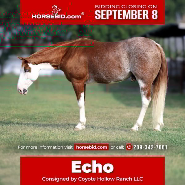 ♦️ 𝐭𝐡𝐞 𝐒𝐞𝐩𝐭𝐞𝐦𝐛𝐞𝐫 𝑺𝒆𝒍𝒆𝒄𝒕 ♦️ Happening now thru MONDAY | SEPTEMBER 8th - Available EXCLUSIVELY on HorseBid's website! For more details and to register visit: www.Horsebid.com CONSIGNOR CONTACT: Coyote Hollow Ranch LLC 2093427061 LOCATION: Mount Vernon, TX BREED: Paint REGISTERED: No COLOR: Brown & white tobiano HEIGHT: 14.1 AGE: 6 GENDER: Gelding Meet Echo, a truly exceptional Paint gelding who stands out not just for his striking good looks, but for his demeanor that makes him one in a million. Echo is the kind of horse who’s always excited to see you—he’s the first to greet you at the gate, ready to share his unshakeable, friendly nature. No matter your experience level, Echo’s calm demeanor and incredible temperament make him a safe, dependable partner for anyone. He’s been there and done that, from doctoring sick cattle out in the pasture to being an absolute rockstar under both English and Western tack. Echo's smooth, effortless gaits make him a pleasure to ride, whether you're looking for an easy, laid-back trail ride or want to practice transitions and movement in the arena. He’s just as at home trotting through the woods as he is taking a walk around the ring, and his versatility is one of the many reasons he’s so highly regarded. Youth riders will find Echo easy to handle, while seasoned riders will appreciate his responsive, but gentle nature—making him perfect for those looking to simply enjoy the ride. He's that one horse you can rely on, whether you're taking a leisurely ride around the farm, riding out for a trail adventure, or needing a safe, dependable partner to teach new riders the ropes. Echo’s smooth transitions and steady rhythm will make anyone feel like a pro in the saddle. He's the perfect addition to any barn, from families looking for a horse that everyone can enjoy to those seeking a trustworthy, fun companion for the trail. Echo doesn’t just ride well—he *lives* well. His safe, loving nature and willingness to please make him a true gem, and he’ll be sure to leave a lasting impression on anyone lucky enough to cross his path. Come meet Echo and experience for yourself what makes him so special—he’s more than just a horse; he’s a lifelong friend waiting for the perfect person to enjoy the ride with!