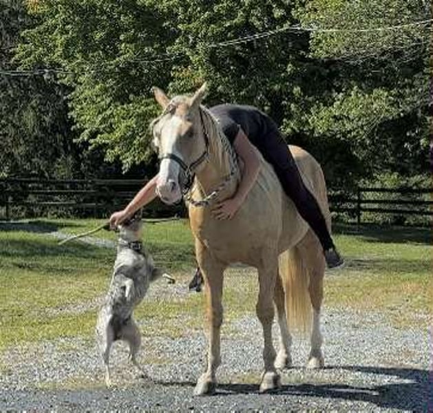 VERFÜGBAR AUF DEM ONLINE-PFERDE-AUKTION bei www.MagicHorseAuction.com GEBOTE sind jetzt geöffnet bis Dienstag, 14. Oktober! – SOFORTKAUF MÖGLICH! *Der endgültige Preis wird auf der Auktionsseite festgelegt* KONTAKT DES AUKTIONSVERKÄUFERS: Roni Renee Turner, 610-806-2613 STANDORT: Narvon, Pennsylvania „Freckled Intoxication“, auch bekannt als „Malibu“, ist ein 5-jähriger, 15 hh großer APHA-Gelding mit einer üppigen Mähne, schönem Palomino-Fell und schokoladenbraunen Sommersprossen über den ganzen Körper verteilt. Mali ist sicher, zuverlässig und voller Charme! Er ist ein anhänglicher Typ mit viel Charakter. Malibu kann alles, was man von einem vielseitigen Pferd erwartet, und ist bereit, dein bester Freund zu werden! Er macht alles, und das sicher! Im Stall hat er keine schlechten Angewohnheiten. Er kann sowohl in der Box als auch draußen gehalten werden, geht mit anderen Pferden aus, aber auch allein. Er zeigt keine schlechten Stallgewohnheiten und ist ruhig im Stall. Er steht an den Kreuzstricken zum Putzen, Satteln, Waschen usw. Er bindet sich gerade am Anhänger fest, um sich vorzubereiten. Mali ist ein fröhlicher Kerl, der Aufmerksamkeit liebt. Er ist sicher im Umgang mit Kindern und Hunden, die um ihn herumlaufen, mit Kühen, die bei ihm stehen – egal was, er ist völlig unbeeindruckt und weiß, wie man einen Scherz verträgt! Er ist ein unkompliziertes Pferd mit einer einfachen Fütterung, ohne Wartungsaufwand und ohne zusätzliche Supplements. Er ist gut beim Tierarzt und Hufschmied, kann beschuht werden oder barfuß laufen. Er kommt im Paddock auf dich zu und lässt sich leicht einfangen. Er liebt es, in der Nähe von Menschen zu sein, und bringt dich mit seiner lustigen Persönlichkeit zum Lachen. Malibu liebt Trailreiten. Er kann anführen, folgen, alleine oder in der Gruppe unterwegs sein. Er geht in einem ruhigen, gleichmäßigen Schritt und lässt sich den ganzen Tag bequem im Gelände reiten. Er ist sicher im Straßenverkehr, bei Fahrrädern, Kinderwagen, Wildtieren und stört sich nicht an meinen Hunden, die ihm hinterherlaufen. Er überquert Logs, Felsen, Wasser und wartet sogar auf dich beim Porta-Potti. Er wäre ein großartiger Campingpartner oder Fuchsjäger. Er hat sogar die Persönlichkeit eines Ehemann-Pferdes. Er ist immer für ein Abenteuer zu haben – pack deine Satteltaschen voll Bier und genieße die Fahrt! Malibu reitet Western, Englisch und Barhuf. Er ist weich in der Hand und lässt sich in einem einfachen Gebiss, einem Halfter oder sogar mit Führstrick reiten! Seine Gänge sind bequem und bergauf geritten. Er wechselt sanft die Gangarten und hört gut auf deine Signale. Es macht Spaß, ihn zu reiten, und er bleibt bei jedem Ritt derselbe. Mali ist das sichere Pferd, auf das deine Kinder einfach aufspringen können, und er passt auf sie auf. Im Viereck geht Mali Schritt, Trab, Galopp, kennt seine Führungen und liebt Springen. Er reitet gesammelt oder im leichten Tempo. Er rückwärts, dreht sich, seitwärts, neck reins, bewegt sich auf dein Bein und kann auf ein kräftiges „Whoa!“ reagieren oder sanft durch die Gangarten abbremsen. Er zeigt viel Potenzial für Ranch-Klassen, leichte Reining-Übungen, Rinderarbeit, Western-Dressage und mehr. Er trabt vorsichtig über Bodenstangen und achtet genau auf seine Füße. Er reitet auf deinem Sitz oder auf deine Stimme. Mali ist verzeihend und wird nicht unruhig, wenn sein Reiter aus dem Gleichgewicht gerät. Er ist immer fröhlich und genießt jeden Ritt. Auch beim Springen zeigt Malibu sein Können! Er springt sanft über kleine Kreuzstangen und über größere Hindernisse sowie Geländesprünge. Er ist ein Naturtalent im Springen und sehr gut bei Distanzen. Er wird nicht heiß oder vorwärts, während er springt. In den Clips, in denen mein Hund mit uns die Cross-Country-Hindernisse überspringt, sieht man, wie ehrlich er ist. Malibu ist ein wunderschöner Bewegungs-Typ und könnte auch in der niedrigen Dressur, beim Vielseitigkeitsreiten oder einfach als zuverlässiges Pferd, das dich unterstützt, eingesetzt werden. Egal, welchen Weg du mit ihm einschlagen möchtest, Malibu ist bereit, dein lebenslanger Partner zu sein und alles mit dir zu machen. Ich habe meine Zeit mit diesem Pferd sehr genossen. Er ist momentan so aufgestellt, dass er in jede Richtung gehen kann. Und er ist auch noch ein echter Hingucker! Wenn Malibu für dich passend klingt, zögere nicht, dich für weitere Informationen zu melden! Versand ist überall möglich.