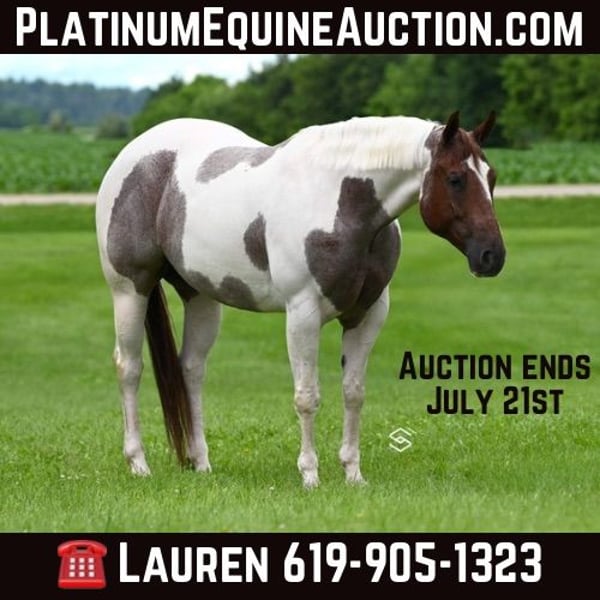 ONLINE AUCTION Place your bids at www.PlatinumEquineAuction.com Starting Bid $3500 Auction ends July 21st, 2024 Need a new saddle? Check out White Rock Saddles on our website or Facebook! Take a look at this beautiful gal that we call “Lady”. This mare stands 15.1 hands tall and has all the class you could hope to find in a horse. She is 6 years old registered in both the APHA and Pinto Horse Association. She has been shown in pleasure classes and ranch riding. “Lady” rides around push button style and has the demeanor to suit the whole family. She’s the kind of horse that will put a smile on your face every time you walk in the barn. Her personality is fun loving and she really wants nothing more than to be easy going. If you want to enjoy a day of leisure just load her up and head out to the trails. She’s very versatile and rides equally well both inside and outside of the arena. What I love about this mare is that she’s not one that you have to maintain. She has no history of injury or lameness and doesn’t require any special shoeing. You will absolutely love this mare, seize the opportunity to own this special horse. Located in Lakeville, MN. Contact Lauren Leslie 619-905-1323 with any questions. ONLINE AUCTION Place your bids at www.PlatinumEquineAuction.com Starting Bid $3500 Auction ends July 21st, 2024 Need a new saddle? Check out White Rock Saddles on our website or Facebook!