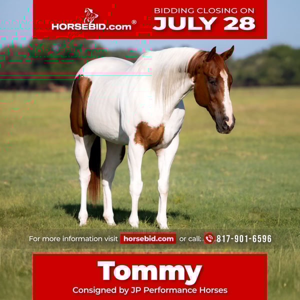 ⚔️ The HORSEMAN's Select ⚔️ Happening now thru MONDAY | JULY 28th - Available EXCLUSIVELY on HorseBid's website! For more details and to register visit: www.Horsebid.com CONSIGNOR CONTACT: JP Performance Horses 817-901-6596 LOCATION: Weatherford, TX BREED: Paint REGISTERED: No COLOR: Sorrel and White HEIGHT: 15.3 AGE: 9 GENDER: Gelding Safe all around family horse! Everyone needs a Tommy in their life! If you are truly looking for a best friend that will be safe and fun to ride with friends, Tommy is definitely one to consider. He’s stands 15.3 hands tall and is like a big puppy dog. He loves attention. Will meet you at the gate ready to go to work. He’s great on trails, rides English and Western. He’s very gentle for the whole family. Rides in traffic, parades, noises don’t bother him and is just a dream to be around. Stands in cross ties, great for the farrier, recent teeth floating and loads and unloads in trailer like a gentleman. He gets along in the herd and is not dominant. We have truly enjoyed having him at the ranch and hope to find him his forever home where he will be loved and spoiled. He truly deserves to have a best friend. You will love his sweet personality as well as his beauty! Feel free to call Jackie with JP Performance Horses at 817-901-6596 with any questions or to set up a time to come try him. Shipping can be arranged anywhere!