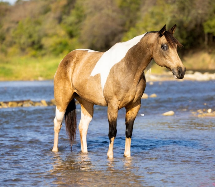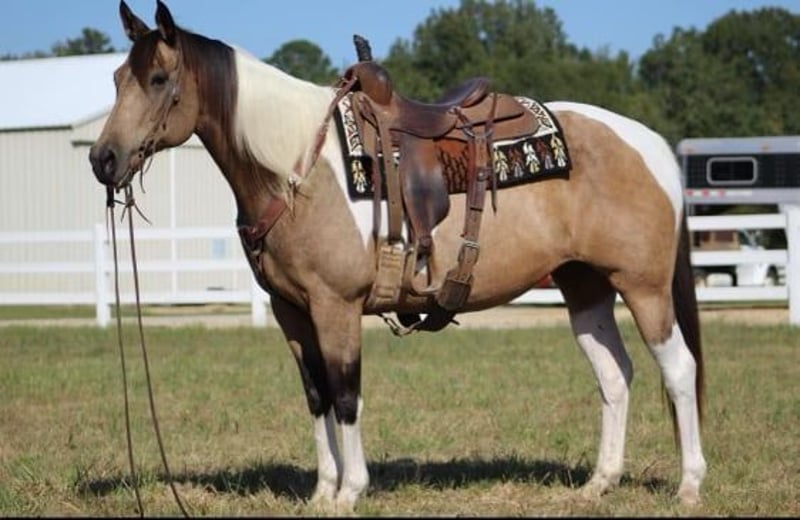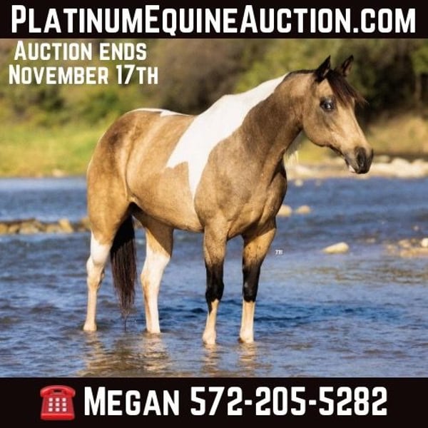 ONLINE AUCTION Place your bids at www.PlatinumEquineAuction.com Starting Bid $3500 Auction ends November 17th, 2024 Need a new saddle? Check out White Rock Saddles on our website or Facebook! Jenna is the most stunning 9 year old buckskin and white paint mare standing at 15.2 hands tall. Not only is she the sweetest horse in the barn, she is stunning to look at and is sure to get you noticed anywhere you go. Jenna has been used in a lesson program, been rode on the ranch doing day work, trail rode and rides English with a beautiful style. She is gentle and great for any member of the family. Most of all she is safe to be around as well as ride. She stands in cross ties for grooming , loads and unloads in the trailer easy, stands for baths, rides bareback, traffic safe and just a great all around horse. Jenna would excel in all the events from showing in Halter to English or Western events. Her personality is definitely sweet and willing to do any job ask of her without any hesitation. She has truly been a pleasure to have in our barn and we look forward to finding her the perfect home where she will be loved! Please call or text Megan at 572-205-5282 with Florinia Equine to arrange a time to come see her in person or have a FaceTime viewing if you live far away. This mare is definitely one you don’t want to miss the opportunity of owning. She is the kind you search long and hard to find that’s perfect for the whole family! She is up to date on coggins and fresh feet trimming. She is currently shod on the front feet, barefoot on the back and is great for the farrier. Shipping can be arranged anywhere. Located in Guthrie, OK. ONLINE AUCTION Place your bids at www.PlatinumEquineAuction.com Starting Bid $3500 Auction ends November 17th, 2024 Need a new saddle? Check out White Rock Saddles on our website or Facebook!