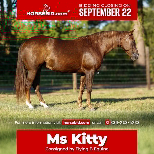 🍁𝒕𝒉𝒆 𝐅𝐀𝐋𝐋 𝑺𝒑𝒆𝒄𝒕𝒂𝒄𝒖𝒍𝒂𝒓🍁 Happening now thru MONDAY | SEPTEMBER 22nd - Available EXCLUSIVELY on HorseBid's website! For more details and to register visit: www.Horsebid.com CONSIGNOR CONTACT: Flying B Equine 330-243-5233 LOCATION: Lufkin, Texas BREED: APHA REGISTERED: Yes REGISTERED NAME: Gunna Be A Star COLOR: Sorrel HEIGHT: 15 AGE: 11 GENDER: Mare *GUNNA BE A STAR* And to us, that is exactly what Ms kitty is! A 2014 APHA mare by the great $16M producing stallion “GUNNATRASHYA” out of a daughter of “GRAYS STARLIGHT”. Ms Kitty stands 15.0HH, stands stout, and has also produced two foals on record as well as won over $1,000 in the NRHA. Ms Kitty is a great first performance horse for a youth or beginner wanting to enjoy the amateur reining or transition into the ranch riding. Ms Kitty is easily maintained at home, does not require a program, stalling or any high maintenance. Ms Kitty is currently being used in our lesson program as well to teach beginner children how to lope as she is easy to maneuver, and transition into her slow, smooth and easy lope! She is beyond forgiving and easy to get along with! She will also leave the arena and go trail ride, cross water, bridges and more! We even rode her through traffic and in town! Ms Kitty has also been exposed to cattle, so helping gather on the ranch is just another thing you can enjoy doing with her! In the arena, Ms Kitty has all the buttons, preforms them effortlessly and is beyond forgiving! She has beautiful transitions, effortless lead changes, controllable spins, and so much more! She side pass to work a gate, goes over tarps, obstacles and more. She will easily transition into the ranch riding, and ranch trail! She would be great for a kid looking for a new best friend to join 4H with, or a beginner to start their show career. At the barn, Ms Kitty is easy and simple! She has absolutely no weave, crib, bite, bolt, kick or rear. She is easy to shoe, bathe, tack and groom. She jumped right onto the trailer and backs off! She is great being stalled but really does enjoy her turn out and will be the first to greet you at the gate! She does not care about other horses and will go out by herself, in a group of geldings or mares with no problems. Ms Kitty is ready to go and is fully UTD on everything, and we even have x-rays on file from when we purchased her. Ms Kitty is with us in Lufkin, Texas and we can help arrange shipping absolutely anywhere! You’re welcome to do your own PPE, come meet her or ask any questions! Please reach out to me at (330) 243-5233.