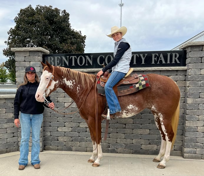 ONLINE AUCTION Place your bids at www.PlatinumEquineAuction.com Starting Bid $3500 Auction ends October 13th, 2024 Need a new saddle? Check out White Rock Saddles on our website or Facebook! Diamond is a stunning 12-year-old registered APHA mare, standing at 14.3 hands tall. She has an eye-catching appearance and an even more impressive resume. Over the years, she has been shown in a variety of disciplines, including youth walk-trot, adult western pleasure, and ranch horse pleasure. In addition, she has won numerous halter classes with children and has been shown in 4-H by multiple young riders. Diamond is a seasoned competitor in open shows as well, and her versatility shines through in her ability to excel in both the show ring and on the trail. She is truly a reliable and gentle mare with no behavioral issues or vices. When it comes to trail riding, Diamond is a dream. She has been on countless camping trips, sometimes lasting all weekend, and never hesitates when encountering obstacles such as water, logs, or ditches. Whether tied to the trailer or out on the trail, she remains calm and well-behaved. Diamond is also parade ready, as she’s carried flags in grand entries without a second thought. Her easygoing temperament makes her a great companion, and she is excellent for routine care such as vaccinations, worming, and farrier work. What truly sets Diamond apart is her impeccable bloodlines and extensive professional training. She responds beautifully to leg cues and has a solid one-hand neck rein, making her a pleasure to ride for all skill levels. In addition to her show and trail experience, she is sound and ready to breed if you’re looking to add quality to your breeding program. Whether you need a family horse, a show partner, or a reliable trail companion, Diamond is the complete package. Don’t miss out on this wonderful mare who can do it all. Located in Lisbon, IA. Contact John McPhail 319-721-7714. ONLINE AUCTION Place your bids at www.PlatinumEquineAuction.com Starting Bid $3500 Auction ends October 13th, 2024 Need a new saddle? Check out White Rock Saddles on our website or Facebook!