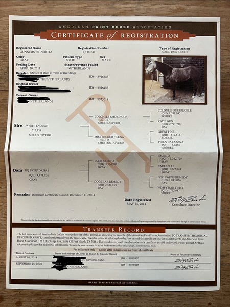 For my Quarter/Paint mare, Quarter Gunners Signorita (born 30-04-2011, 1.47 m), I am looking for a loving stable. She is an excellent mother with a beautiful pedigree. She has tested N/N on the 7-panel genetic test and has a striking color, making her ideal for breeding! Last year, she gave birth to a lovely, gentle foal. Blue is registered with APHA and has reining training. She competed extensively in reining competitions with her previous owner. I have only ridden her recreationally, and she was fully health-checked by me before purchase, including X-rays. Blue is a forward-going mare and a pleasure to ride recreationally. If you are consistent and can clearly lead her, she will be a wonderful partner. She is not suitable for beginners. She enjoys outdoor rides in the woods and can be ridden bitless. She is gentle with children and other animals and has a curious nature. She is not problematic in turnout with other horses. She is traffic-safe, well-behaved at the farrier and dentist, handles the wash station well, and loads easily onto the trailer. If interested, please contact me personally: +31 6 42085850. She will only go to a good match. Riding schools and traders are kindly asked not to respond.