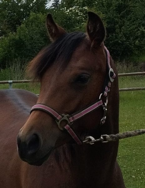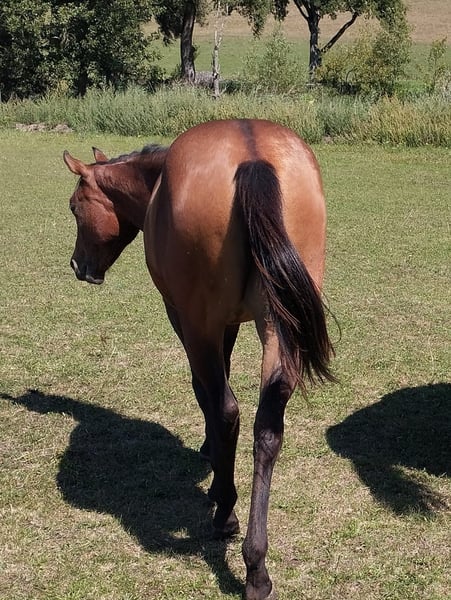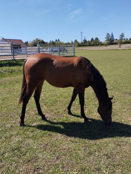 CM Someone Like You - eine bildschöne Paint Horse Stute, geboren am 03. Mai 2024. Sie präsentiert sich in der Farbe bay solid, ganz ohne Abzeichen, mit einem geschätzten Endmaß von etwa 150 cm. Ihr Körperbau ist korrekt, rahmig und gut bemuskelt - eine junge Dame mit klarer Perspektive und gesunder Entwicklung. Sie wächst artgerecht im Offenstall auf, eingebunden in einen Herdenverband mit anderen Jungpferden, was ihr ein stabiles Sozialverhalten und ein entspanntes Wesen ermöglicht. Von Beginn an wird sie regelmäßig entwurmt und kennt bei Abgabe sowohl den Tierarzt als auch den Hufschmied. Charakterlich zeigt sie sich äußerst lieb, menschenbezogen und neugierig. Sie ist brav im Umgang, anhänglich und sehr umgänglich. Bereits jetzt wird sie regelmäßig gehändelt, kennt das Fohlen-ABC und zeigt sich lernwillig sowie intelligent. Ihre Bewegungen sind leicht und schwungvoll. Ihre Abstammung vereint interessante Linien aus Allround- und Reining-Pedigrees und macht sie zu einer spannenden Nachwuchsstute mit vielseitiger Zukunft - egal ob als spätere Turnierpartnerin oder zuverlässige Begleiterin im Freizeitbereich. CM Someone Like You wird mit offiziellen APHA-Papieren sowie Equidenpass abgegeben - ein echtes Zukunftspferd mit bester Basis für eine erfolgreiche Laufbahn.