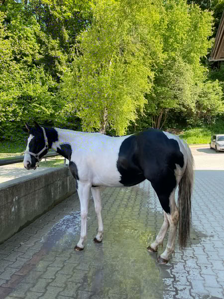 Born: January 2023 Height: approximately 15.2–15.3 hh Pedigree Sire: Passionate King Cody PH Dam: AS Cherokee Rose PH ✨ Our beautiful Paint Horse mare, AS Passionate Ellie, impresses with her expressive type, harmonious temperament, and stunning black tobiano markings. A premium foal with a score of 7.8, she offers excellent prospects for sport, leisure, or breeding. ✨ - Ellie is consistently friendly, calm, and human-oriented - Curious, open-minded, and eager to learn - Enjoys work and learns quickly - Loading and traveling in the trailer are no problem for her - Knows and loves children and dogs - We regularly do groundwork and lunging - Is familiar with rider weight; my children can sit on her without a saddle – she handles everything effortlessly Raised in an open stable but also familiar with paddock boxes Regularly dewormed, vaccinated, and introduced to the farrier She will be professionally backed in January (price increases with training) Ellie would also be well-suited for breeding.