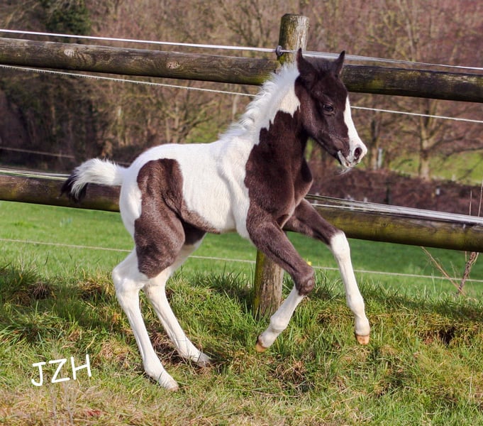 Prawidłowo zbudowana klaczka Paint Horse. Równomiernie narysowany z 2 ciemnymi oczami. Ciekawy i jasny. Dorasta z większą liczbą źrebiąt. Homozygotyczny Tobiano. Być może również homozygotyczny dla czerni. 5 Test panelowy Z amerykańskimi dokumentami i paszportem PHCG. Rodziców można odwiedzić. Oba charakteryzują się doskonałymi właściwościami konia jeździeckiego. Zapytania prosimy tylko telefonicznie. 01757217229