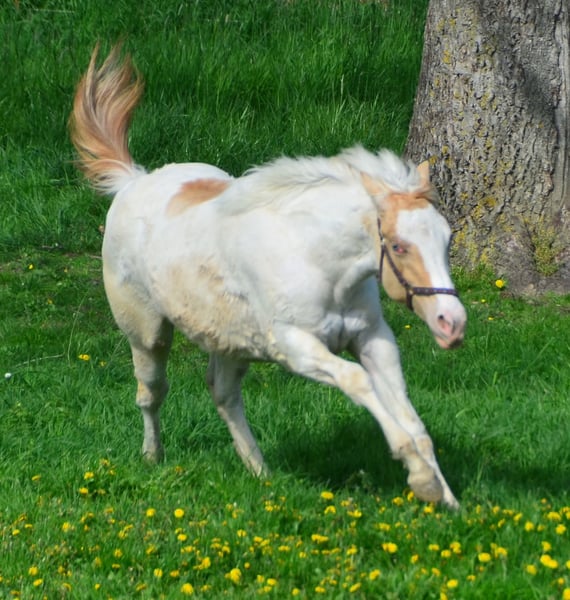 Lyria to piękna klaczka rasy Paint Horse w kolorze Gold Dun Champagne Tovero, o dwóch stalowoniebieskich oczach. Urodzona 03.06.2023 r. Jest milutka, słodka i dobrze wychowana. Lubi trzymać kopyto na pedale gazu i pędzić przez padok. Pokazuje swój niesamowity talent do kontroli prędkości, zmian w kłusie i zatrzymań! Ma 7 panel N/N po rodzicach. Lyria wygrała pokaz hodowlany klaczek PHCG z ogólną oceną 8.0.