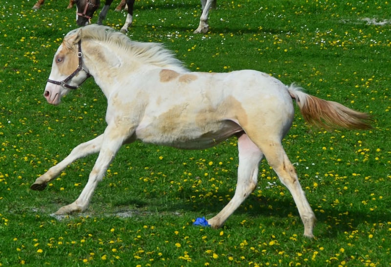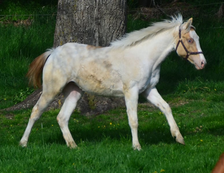 Lyria is a beautiful Paint Horse bag in Gold Dun Champagne Tovero, with two steel blue eyes. Born 03.06.2023 She is cuddly, sweet, and well-behaved. He likes to have his hoof on the accelerator pedal and dashes across the paddock. Shows her amazing talent for speed control, canter changes and stops! She is about the parents 7 panel N/N. Lyria won the PHCG filly show with an overall score of 8.0.