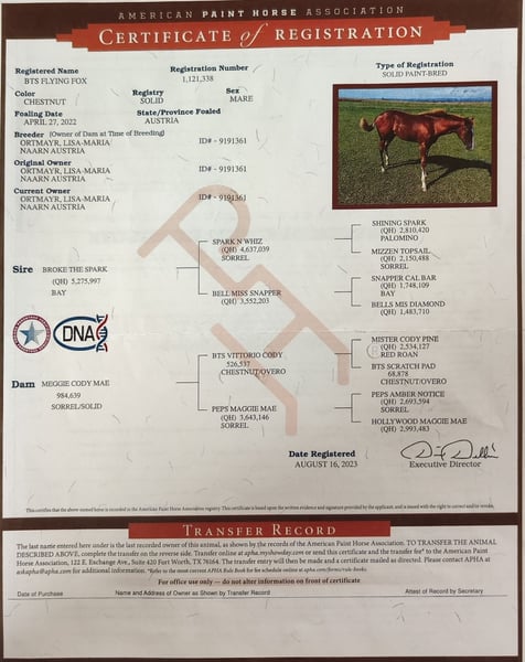 Zum Verkauf steht eine hübsche, großrahmige American Paint Horse Stute, geboren am 27.04.2022, in der Farbe Chestnut, mit amerikanischen Papieren. Foxy wurde bisher vom Boden aus nach Natural Horsemanship gearbeitet und ist bereits gut vorbereitet für ihre weitere Ausbildung. Sie ist an Sattel, Zaumzeug und Reitergewicht gewöhnt, wurde aber noch nicht geritten. Foxy kennt die Arbeit vom Boden und zeigt sich dabei lernwillig und aufmerksam. Sie ist zudem verladefromm und fährt brav im Hänger. Sie war bereits auf mehreren Wochenendkursen dabei und kennt sowohl Offenstall als auch Boxenhaltung. Foxy ist selbstverständlich brav beim Schmied (regelmäßig beschlagen). Aufgrund ihres Alters und Ausbildungsstandes ist sie nicht für Anfänger oder Kinder geeignet. Sie sucht einen erfahrenen Menschen, der sie weiter fördert und ausbildet. Die Stute wird aus Zeitmangel verkauft!