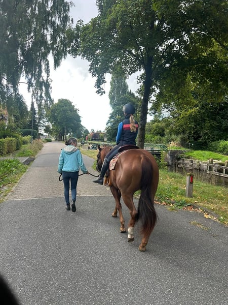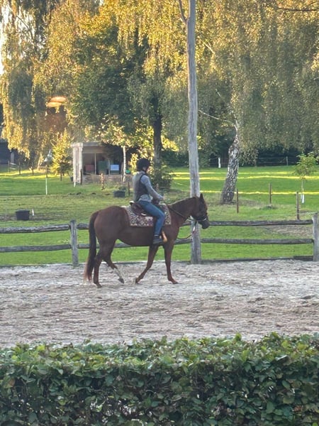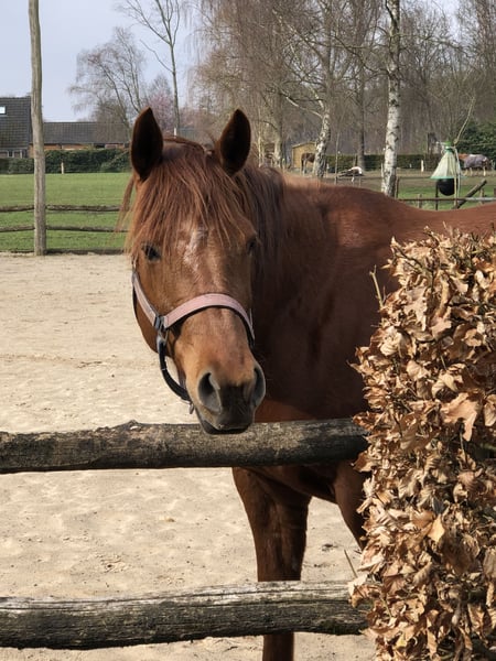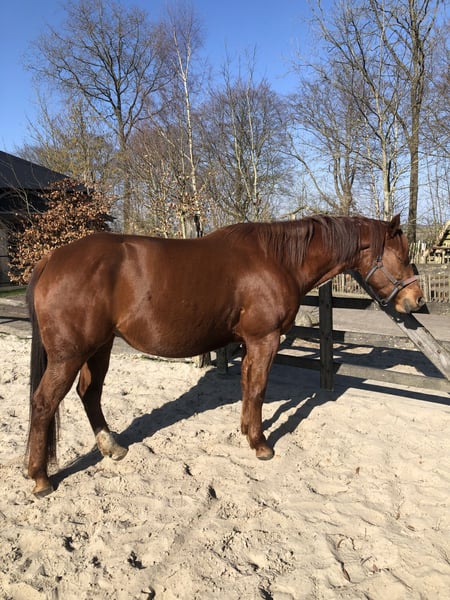 Lieve APHA merrie te koop, Magic Dancer for Gold (14-5-2020) Kleur: Chestnut, Solid Paint. • Panels: 7 N/N Pedigree Vader: Painted for Gold Moeder: Skylar My MagicDancer Karakter: sociaal, lief, werkwillig, is sensitief. Gaat graag mee op buitenrit ook alleen, wandelend of naast fiets Kan longeren, kent grondwerk en dubbele lijnen, is zadelmak maar niet doorgereden. Onder zadel moet weer opgepakt worden. Uitstekende fokmerrie, heeft in 2025 haar eerste veulen gehad. Dancer staat in kleine kudde en is sociaal met andere dieren. Wegens gezondheidsredenen van eigenaresse wordt dit dier te koop aangeboden. Evt. ook Westernzadel op maat over te nemen. Voor meer informatie graag PB of neem contact op met Jos 0031-(0)6-40586106.