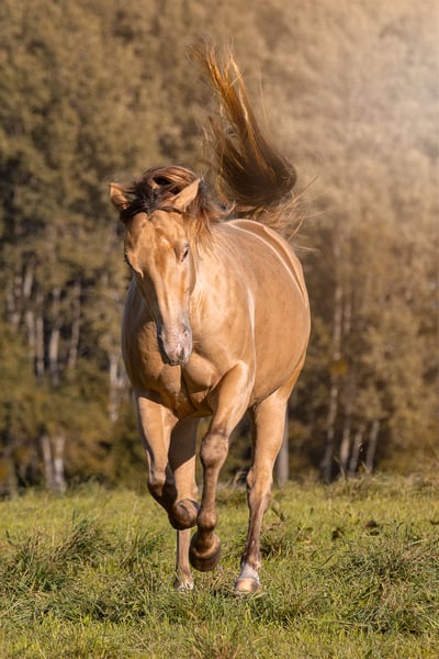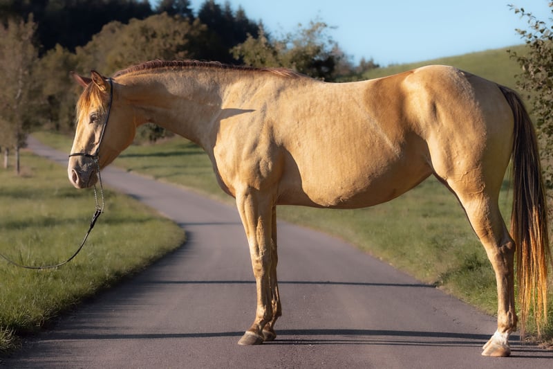 Lynn to topowa klacz reiningowa z "metalicznym lakierem" w kolorze złotym dla ambitnych jeźdźców pokazowych. Nie tylko dobrze wygląda, ale jest także niezwykle wysportowana, utalentowana, zrównoważona i ma maślane, gładkie chody. Ponieważ jest również bardzo dobrym jeźdźcem, nadaje się do innych dyscyplin, takich jak trail, jazda na ranczu, jeździectwo i halter. Z tym koniem na pewno przyciągniesz uwagę! Niestety mam tylko piaszczystą arenę i za mało czasu dla Lynn, więc nie byłem jeszcze w stanie w pełni wykorzystać jej potencjału. Została łagodnie i dokładnie wprowadzona i wszędzie chodzi sama. Jest prawidłowo zbudowana i otrzymała doskonałe oceny jako źrebię, w wyniku czego zajęła również 6. miejsce w Bundeschampionacie (patrz dokumenty). Dlatego idealnie nadaje się również do hodowli. Lynn musi zostać sprzedana z ciężkim sercem ze względów zdrowotnych i prywatnych w dobre, ale wspierające ręce. Miejsce przed ceną.