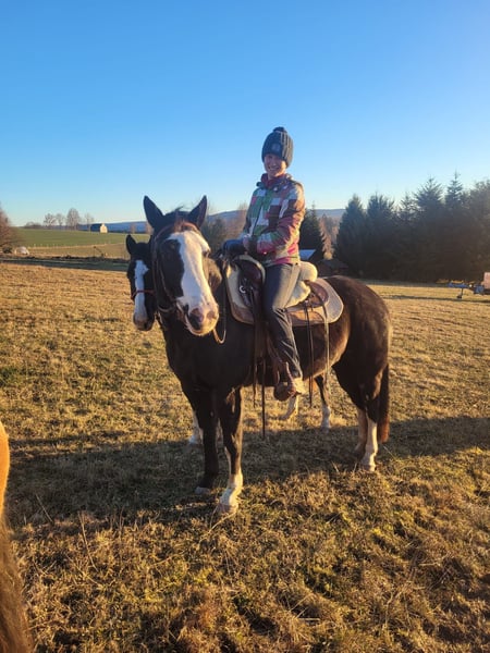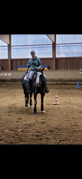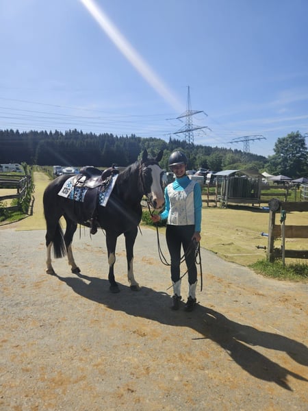 Wir suchen für unsere BS Coosaders Boogie ein neues, liebevolles Zuhause. Boogie ist eine 2018 geborene Paint-Horse-Stute mit einem Stockmaß von ca. 1,52 m. Sie stammt ab von Colonel Coosader und ist seit 2022 in unserem Besitz. Sie ist regelmäßig geimpft und entwurmt. Im Winter stehen unsere Pferde nachts in der Box, im Sommer genießen sie 24 Stunden Weidegang. Mit Boogie habe ich mein Westernreitabzeichen 4 absolviert und auch Turniere in der Leistungsklasse 4 besucht, bei den ich in der Pleasure, Horsemanship, Showmanship und RanchRiding auch plaziert war. Die Turnierathmosphäre hat sie ruhig und souverän gemeistert. Lehrgänge und intensives Training sind jedoch nicht unbedingt ihre Lieblingsbeschäftigung – sie ist eher eine ruhige Stute, die eine feste Bezugsperson sucht und am liebsten entspannt geritten wird. Besonders wohl fühlt sie sich bei ruhigen Ausritten ins Gelände. Dort ist sie sowohl in der Gruppe als auch alleine gut händelbar. 2024 hat Boogie ein wunderschönes Hengstfohlen bekommen. Sie hat beim ersten Versuch mit Frischsamen direkt aufgenommen und sowohl die Trächtigkeit als auch die Geburt problemlos gemeistert. Daher können wir sie uns auch weiterhin gut in der Zucht vorstellen. Leider leidet Boogie an einer asthmatischen Erkrankung. Während der Sommermonate zeigt sie keinerlei Symptome. In der Winter- und Frühjahrszeit kann Husten jedoch, bei nasskaltem oder nebligem Wetter, auftreten. Aus diesem Grund wird sie bevorzugt als Zucht- oder Freizeitpferd abgegeben. Wir wünschen uns für Boogie ein Zuhause mit einer festen Bezugsperson, die ihr die Zeit gibt und die sich den Umständen anpasst. Für weitere Informationen gerne ein persönliches Gespräch.