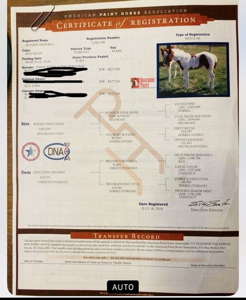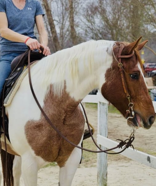 ONLINE AUCTION Place your bids at www.PlatinumEquineAuction.com Starting Bid $3500 Auction ends October 12th, 2025 Need a new saddle? Check out White Rock Saddles on our website or Facebook Introducing this beautiful ranch or WP mare we call Trouble. She stands right at 15.2 hands. She has the look to get you noticed, personality and class you hope to find. Her favorite past time is to blow bubbles in the water or grab the hoof pick and swing it. She has personality **2018 ~ red roan tobiano (APHA/PtHA) Sire: Rockin Vital Signs Dam: Executive Trouble by Fancy Bonanza 2019 $ earner in Paint Futurity- longe line 2021-top 10 color Congress breed pinto show; youngest horse in walk/trot WP, placed top 5 out of 35 horses Since, she’s shown and placed in fun shows. Trouble rides around graciously and has the demeanor to be enjoyed by the entire family. She’s a barn favorite by many and puts a smile on your face. She wants nothing more than to be easy going. Easy to load! Load her up if a day on the trails is your thing. She’s excellent for the farrier/vet/grooming etc. rides solo in or out of arena. She’s an easy keeper. Take this girl and show in WP walk/trot and win or move her into ranch which is the direction we’ve gone with her. She’s been hauled, used in ranch clinics, will cross bridges, spins, side passes. ***WP or ranch for experienced youth, novice, or amateur. Will still slow for WP walk trot, but prefers the ranch lope. Been in ranch training for 6 months. Pretty and soft mover- head turner! Personal issues (Divorce) is the only reason this sweet mare is available. Take advantage of this opportunity to own this special mare. She’s flashy, sweet, and beautiful **Clean x-tays of feet, legs, and back available upon request. I have additional trail videos and videos of her riding around the arena at home also if needed. Contact Lisa – texting is quicker but I’ll try to respond to calls as soon as possible 843-450-1383 ONLINE AUCTION Place your bids at www.PlatinumEquineAuction.com Starting Bid $3500 Auction ends October 12th, 2025 Need a new saddle? Check out White Rock Saddles on our website or Facebook