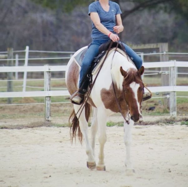 ONLINE-AUKTION Bieten Sie jetzt auf www.PlatinumEquineAuction.com Startgebot: 3.500 USD Auktion endet am 12. Oktober 2025 Benötigen Sie ein neues Sattel? Schauen Sie bei White Rock Saddles auf unserer Website oder Facebook vorbei. Wir stellen Ihnen diese schöne Ranch- oder WP-Stute vor, die wir Trouble nennen. Sie ist ca. 1,52 m groß. Ihr Erscheinungsbild sorgt für Aufmerksamkeit, dazu bringt sie Persönlichkeit und Klasse mit. Ihre Lieblingsbeschäftigung ist, Blasen im Wasser zu machen oder den Hufkratzer zu greifen und damit zu spielen. Sie hat eine lebendige Persönlichkeit. **2018 ~ rotes Tobiano-Farbmuster (APHA/PtHA) Vater: Rockin Vital Signs Mutter: Executive Trouble by Fancy Bonanza 2019: Preisgeld in Paint-Futurity – Longeline 2021: Top 10 im Farb-Congress-Pinto-Show; jüngstes Pferd im Walk/Trot WP, Platzierung unter den Top 5 von 35 Pferden** Seitdem hat sie an Showveranstaltungen teilgenommen und Platzierungen erreicht. Trouble bewegt sich anmutig und hat die Gelassenheit, die die ganze Familie genießen kann. Sie ist bei vielen Stallbesuchern beliebt und zaubert jedem ein Lächeln ins Gesicht. Sie ist sehr umgänglich und entspannt. Einfach zu verladen! Packen Sie sie ein, wenn ein Tag auf den Trails Ihr Ding ist. Sie ist hervorragend für Schmied, Tierarzt, Pflege usw. geeignet. Sie kann alleine im oder außerhalb der Arena geritten werden. Sie ist leicht zu pflegen. Nehmen Sie dieses Mädchen und zeigen Sie sie im WP Walk/Trot und gewinnen Sie oder führen Sie sie in die Ranch-Disziplinen, was wir mit ihr angestrebt haben. Sie wurde transportiert, in Ranch-Clinics eingesetzt, überquert Brücken, macht Spins und Side Passes. *** WP oder Ranch für erfahrene Jugendliche, Anfänger oder Amateure. Sie bremst noch für WP Walk/Trot, bevorzugt aber die Ranch-Galoppade. Seit 6 Monaten in Ranch-Training. Schön anzusehen, weiche Bewegungen – ein echter Blickfang! Persönliche Gründe (Scheidung) sind der einzige Grund, warum diese liebe Stute jetzt zum Verkauf steht. Nutzen Sie die Gelegenheit, diese besondere Stute zu besitzen. Sie ist auffällig, liebenswert und wunderschön. **Saubere Röntgenaufnahmen von Hufen, Beinen und Rücken auf Anfrage erhältlich. Zusätzliche Trail-Videos sowie Videos vom Reiten in der Arena zu Hause sind bei Bedarf ebenfalls vorhanden. Kontaktieren Sie Lisa – SMS ist schneller, aber ich versuche auch, Anrufe so bald wie möglich zu beantworten: 843-450-1383**