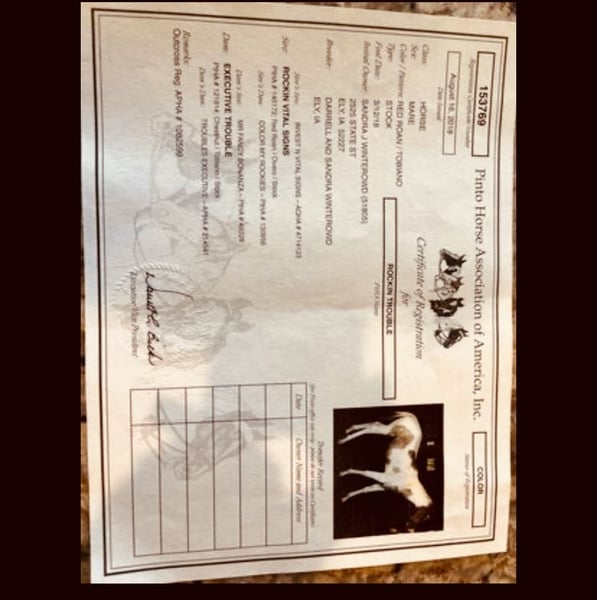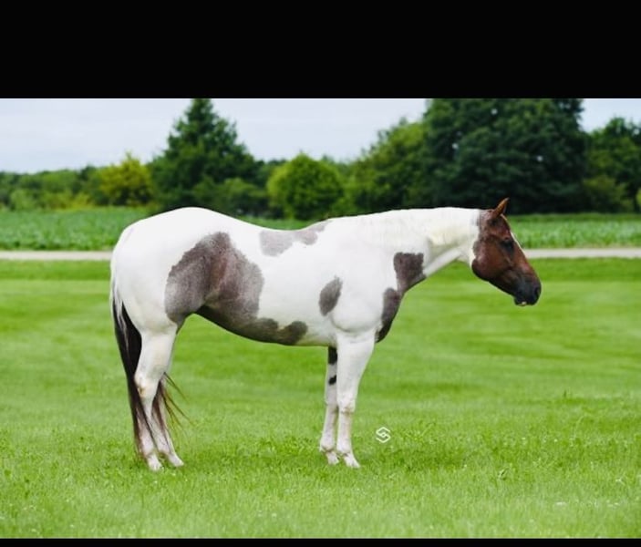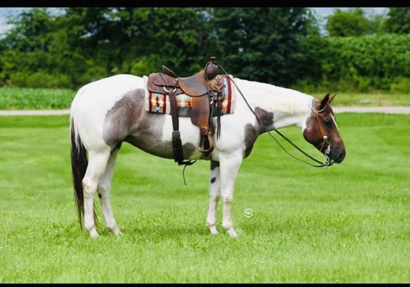 SUBASTA EN LÍNEA Haz tus ofertas en www.PlatinumEquineAuction.com Oferta inicial $3,500 La subasta termina el 12 de octubre de 2025 ¿Necesitas una silla nueva? Visita White Rock Saddles en nuestra página web o en Facebook Presentamos a esta hermosa y versátil yegua de rancho o WP, a la que llamamos Trouble. Mide aproximadamente 1.55 m (15.2 manos). Tiene la presencia para captar miradas, además de la personalidad y clase que buscas. Su pasatiempo favorito es hacer burbujas en el agua o coger el peine de casco y jugar con él. Tiene mucha personalidad. **2018 ~ tobiano rojo roano (APHA/PtHA) Padre: Rockin Vital Signs Madre: Executive Trouble por Fancy Bonanza Ganadora de $ en Futurity de Paint en 2019 - en línea de trabajo En 2021, estuvo entre los 10 mejores en la exposición de color del Congreso en pinto; la yegua más joven en WP en paso/trote, quedó entre las 5 mejores de 35 caballos. Desde entonces, ha participado en exhibiciones y ha obtenido buenos resultados en shows divertidos. Trouble se desplaza con gracia y tiene un carácter que la hace apta para toda la familia. Es una favorita en el establo y siempre alegra el día. Quiere ser una yegua tranquila y fácil de manejar. Fácil de cargar. Llévala en rutas de senderismo si eso es lo tuyo. Es excelente para el herrador, veterinario, cuidado, etc. Puede montar sola dentro o fuera de la pista. Es una yegua de fácil cuidado. Lleva a esta yegua a competir en WP paso/trote y gana, o déjala en el estilo ranchero, que es la dirección en la que hemos trabajado con ella. Ha sido transportada, utilizada en clínicas de ranch, cruzará puentes, hará giros y pasará de lado. ***Ideal para jóvenes experimentados, novatos o amateurs en WP o ranch. Aunque puede reducir el paso para WP paso/trote, prefiere el trote de ranch. Ha estado en entrenamiento de ranch durante 6 meses. Hermosa y de movimiento suave, ¡llama la atención! La única razón por la que esta dulce yegua está disponible son asuntos personales (divorcio). Aprovecha esta oportunidad de adquirir a esta yegua especial. Es llamativa, dulce y hermosa. **Radiografías limpias de pies, patas y espalda disponibles bajo solicitud. También tengo videos adicionales de senderismo y de ella montada en la pista en casa, si los necesitas. Contacta con Lisa – los mensajes de texto son más rápidos, pero intentaré responder a las llamadas lo antes posible al 843-450-1383. SUBASTA EN LÍNEA Haz tus ofertas en www.PlatinumEquineAuction.com Oferta inicial $3,500 La subasta termina el 12 de octubre de 2025 ¿Necesitas una silla nueva? Visita White Rock Saddles en nuestra página web o en Facebook