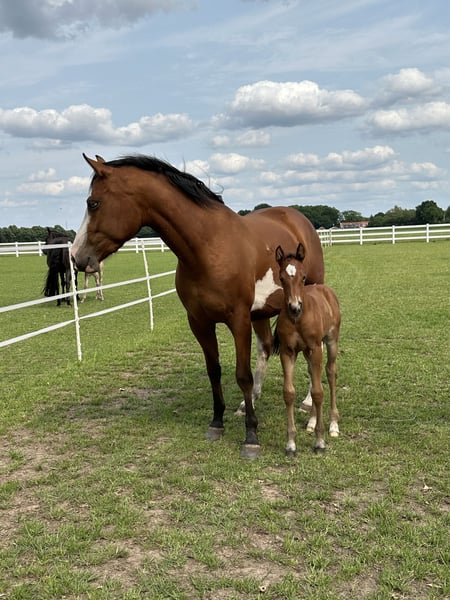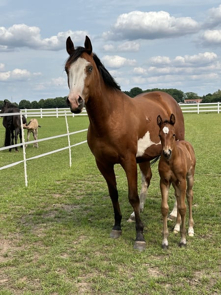 Vendo encantadora potranca "Ruby" (nacida el 20.05.2025) ¡Nuestra pequeña Ruby está buscando un nuevo hogar amoroso a partir de otoño! Es una hermosa potranca castaña con un gran carácter: muy cariñosa, curiosa y sociable. Ruby es amigable y abierta a todo y todos, ya sea personas o animales. Creció de manera adecuada en un grupo y ya está aprendiendo de forma lúdica el ABC de los potros. Ruby está acostumbrada a llevar la cabezada, da con gusto los cuatro cascos y ya está habituada a pequeños paseos; durante estos, muestra interés, calma y disposición para aprender. ¿Quieres que Ruby se quede con nosotros un poco más para su crianza? ¡No hay problema! Puede seguir creciendo en nuestro grupo en los grandes prados y disfrutar de su infancia al máximo. Flexibilidad financiera: Es posible un pago a plazos hasta el destete para facilitarte la entrada. Si estás seriamente interesado, estaremos encantados de recibir un mensaje y contarte más sobre ella. ¡Por favor, no envíes correos electrónicos! Contáctanos por teléfono al: 01624348386