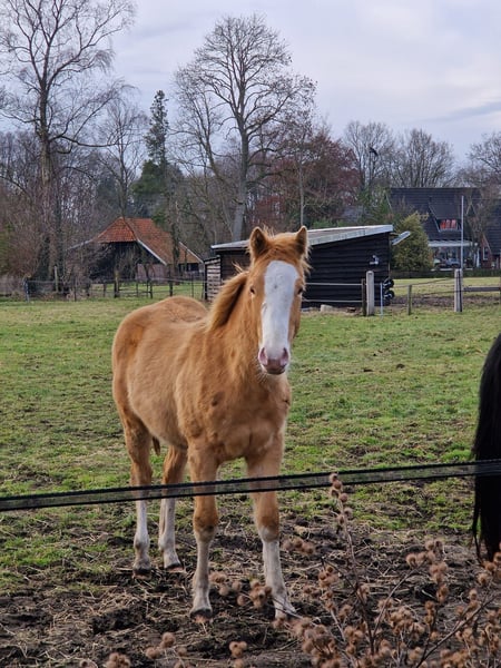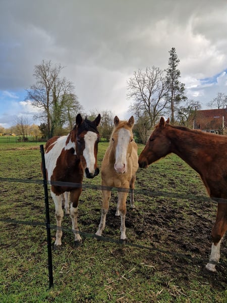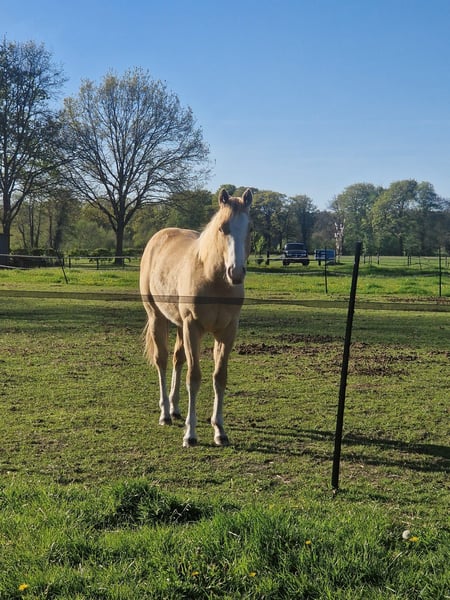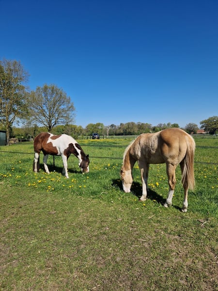Met trots bied ik twee lieve Paint Horses aan, beide gefokt uit mijn eigen merrie Indian Slide. De merrie is ingeschreven in het APHA stamboek. Beide veulens zijn geregistreerd bij het APHA en hebben een fijne, eerlijke basis meegekregen. De veulens zijn opgegroeid in een gezonde, sociale omgeving. Ze zijn bekend met dagelijkse verzorging en omgang. 🐴 Nugget – Indian Honey Bumblebe - Hengst van maart 2025 - Kleur: Champagne gold - Huidige schofthoogte: ca. 140 cm - Verwachte eindhoogte: 150 – 155 cm - Afstamming: Bumblebee Gun Olena - Vraagprijs: €10.000 Nugget is een jonge hengst met een speels, energiek en nieuwsgierig karakter – een echte “kleuter” die de wereld nog volop aan het ontdekken is. Hij toont veel persoonlijkheid en potentie, en zal met de juiste begeleiding uitgroeien tot een prachtig paard. Zijn bijzondere champagne gold kleur maakt hem een echte blikvanger. Hij heeft een correcte bouw en laat veel aanleg zien voor de toekomst, zowel recreatief als in de sport of fokkerij. Algemene informatie - Beide veulens zijn APHA geregistreerd - ingeënt - Paspoort - Bekend met hoefsmid - Opgegroeid in een natuurlijke, sociale omgeving - Staan 24/7 weidegang - Bekend met basis omgang en dagelijkse verzorging Ze worden alleen verkocht aan een passend en goed thuis. Kwaliteit en welzijn staan voorop. Handelaren hoeven niet te reageren.