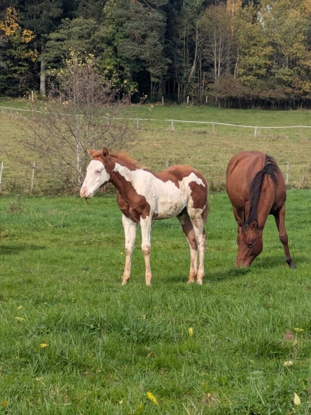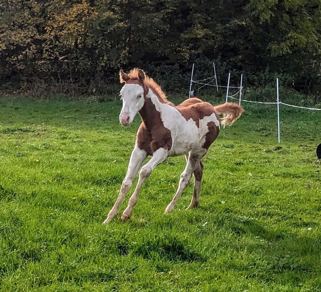 Verkaufe American Paint Horse Hengst – Splashed Overo, Geburtsjahr 2024 Zum Verkauf steht ein wunderschöner American Paint Horse Hengst, geboren im Jahr 2024. HI JACK TOP GUN besticht durch seine wunderschöne Scheckung und sein freundliches Wesen. Mit einem geschätzten Endstockmaß von 147 cm steht er im Standardpferdemaß der Reiner. Wer ein vielseitiges und charakterlich ausgeglichenes Pferd sucht, ist bei Hi Jack an der richtigen Adresse. Der junge Hengst ist gesund, gut sozialisiert und wurde liebevoll aufgezogen. Er eignet sich sowohl für den Freizeitbereich als auch für die Show / Zucht. Seine Eltern überzeugen mit bestem Charakter und Gesundheit. Sie können ebenfalls besichtigt werden, sowie 2 ältere Vollgeschwister von Hi Jack. Hi Jack Top Gun stammt mütterlicherseits aus einer Stocktype Ranch Horse Stute mit stabilem Fundament, umsichtigem Charakter und außerordentlich bequem zu reiten. Die Mutter JOKERS ENTERPRISE, eine Quarterhorse Stute, geht zurück auf sehr widerstandfähige und vielseitig einsetzbare kanadische Linien. Sein Vater vereint die erfolgreichsten Reining Linien, gepaart mit bestem Charakter und unglaublicher Lernbereitschaft. Vater WHIZ MY LITTLE GUN, ein Ausnahmehengst aus der Zucht von Steffen Breug, der so sanft und gutmütig ist, dass die Fohlen mit Mutter und Vater gemeinsam im Herdenverband aufwachsen dürfen. Hi Jack hat wie seine Eltern einen freundlichen, sehr angenehmen Charakter. Ihn bringt so schnell nichts aus der Ruhe. Seine Umgebung nimmt er gerne genau unter die Lupe. Seine schönen Bewegungen offenbaren, die väterliche Reiningabstammung. Er liebt es Aufmerksamkeit zu bekommen und neue Dinge zu lernen. Putzen, Hufe ausschneiden, Spaziergänge und Hängerfahren kann er routiniert. Als nächstes stehen Ausritte als Handpferd auf dem Programm. Paint Horse Papiere sind beantragt. Bei Interesse oder für weitere Informationen stehe ich gerne zur Verfügung. Besichtigung nach Vereinbarung möglich.