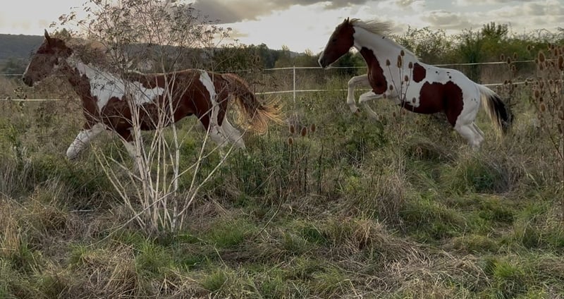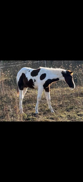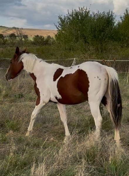 Sehr gelassener zutraulicher Jährlings -Hengst abzugeben. Er wurde am 13.6.24 geboren . Aus eigener Zucht . Farbe Bay . APHA Papier. Die letzten Fotos zeigen ihn als Fohlen . Über seinen Vater *DANCING BOYS OKIE* und seine Mutter *KIWAS LITTLE CHEYENNE* ist er tobiano homozygot (vererbt immer seine Scheckung) und 7 - fach Panel negativ . Er hat also Reining - und Allround- sowie Cowhorse - Gene . Er wird sicher ein guter Partner im Freizeit Reiten werden . Er wäre aber auch für den Sport offen . Er muss aber kein Hengst bleiben. Er kennt Hunde , Katzen und auch Lärm von Landmaschinen und zeigt dabei seinen unerschrockenen ruhigen Charakter. Leichte Nach Aussen Stellung des rechten Hufes ab dem Fesselgelenk , was ihn aber in keiner Weise beeinträchtigt in allen 3 Gangarten . Ist bisher deutlich besser geworden und wird bei entsprechender Hufbearbeitung sich im Laufe des weiteren Wachstums noch verbessern . Daher der angesetzte Preis . Er wächst mit anderen Junghengsten auf und war vorher mit seiner Mutter in einer gemischten kleinen Herde auf großen Koppeln . Er gibt brav die Hufe , Hänger ist kein Problem , kennt bereits Fellsattel und leichte Gewichte , ist natürlich halfterführig, geimpft , entwurmt . Er ist neugierig und offen , bleibt stets gelassen . Er kann natürlich gern besichtigt werden .