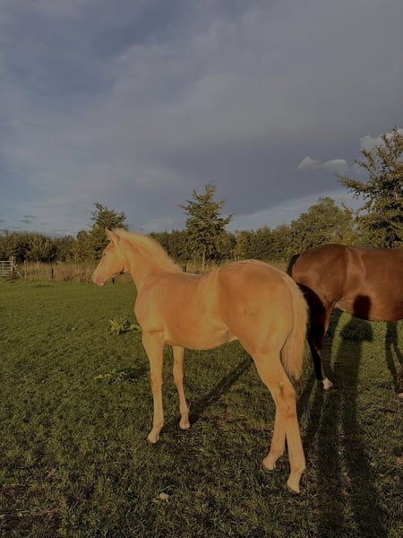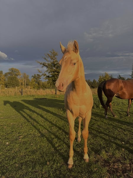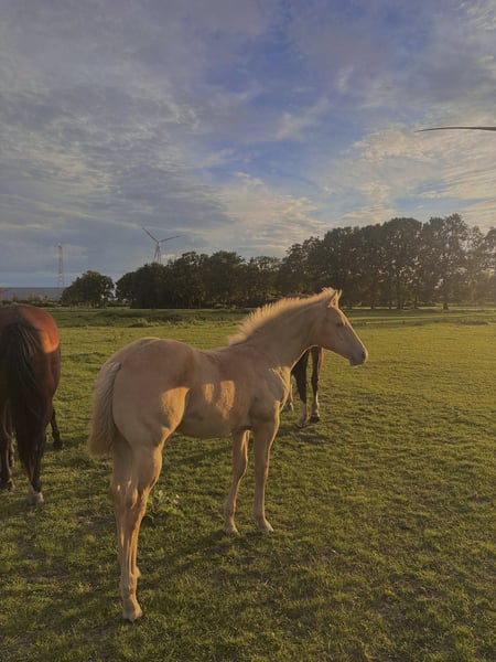 Back available due to buyer not fulfilling prior agreement Flint N Invest Gold, born on May 15, 2025, is an eye-catching gold champagne colt sired by our own stallion SH Invest N Champagn. Just like his sire, he stands out in both looks and character. Details Name: Flint N Invest Gold (APHA) Date of birth: May 15, 2025 Color: Gold Champagne Expected height: 1m55 Sire: SH Invest N Champagn APHA papers: pending Panel test: in progress Microchip & passport: completed Dewormed: yes Weaned: yes Trailer experience: twice Description Flint was born and raised in a herd, which makes him well-socialized and balanced in temperament. He shows a curious, people-oriented, and willing attitude a young stallion with presence and great potential for someone looking for a lifelong partner. Location: Meerhout, Belgium Note: Serious inquiries only. Visits or further information upon request. Falls within the normal - higher price range.