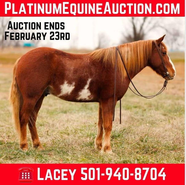 ONLINE AUCTION Place your bids at www.PlatinumEquineAuction.com Starting Bid $3500 Auction ends February 23rd, 2025 Need a new saddle? Check out White Rock Saddles on our website or Facebook! Hawk is a charming paint gelding with lots of class, chrome, personality, and substance to last. At 9 years old and standing an ideal 14.1 hands, he is the right size for any youth or adult. Hawk has been a family favorite and is everyone’s go-to mount for all tasks. He knows a full days work and has a perfect one-hand neck rein with a naturally low headset making any job a breeze. Hawk has the friendliest disposition and is always ready to take on something new. He crosses logs, ditches, creeks, and other obstacles with confidence and ease. Hawk goes where you send him with trust and never hesitates. He has seen many miles of trails and navigates rough terrain excellent. Hawk lopes beautiful circles and catches both leads with flawless departures. This kind gelding is a true gentleman on the ground and is easy to groom, tack up, mount, bathe, load, etc. Hawk has been used at the cow sale penning back, loading trucks, working gates and has seen all aspects of ranch work. Hawk has been an absolute pleasure to own and I cannot wait to see him excel with a new family and/or operation! Watch his full Youtube video, feel free to reach out with any questions, and arrange a visit or a FaceTime with Hawk! Located in Quitman, AR. Contact Lacey Wilf 501-940-8704 with any questions. ONLINE AUCTION Place your bids at www.PlatinumEquineAuction.com Starting Bid $3500 Auction ends February 23rd, 2025 Need a new saddle? Check out White Rock Saddles on our website or Facebook!