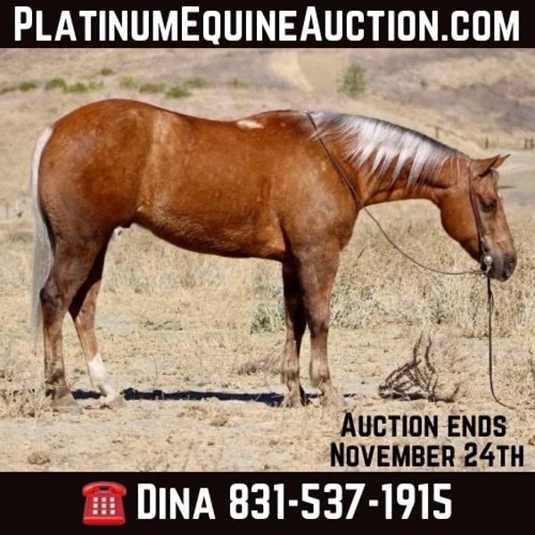 ONLINE AUCTION Place your bids at www.PlatinumEquineAuction.com Starting Bid $3500 Auction ends November 24th, 2024 Need a new saddle? Check out White Rock Saddles on our website or Facebook! Bentley is true to his name luxury on four legs! At 14.2 hands this golden beauty, is 8 year-old gelding is as comfortable as he is stylish. Bentley will tackle steep terrain gathering cattle or navigate busy streets carrying flags without flinching, Bentley does it all with an easy-going demeanor that’s sure to win hearts everywhere he goes. Plus, he’s as friendly as they come a true “puppy dog” at heart with no vices whatsoever! You’ll find yourself captivated by every moment spent around this sweet-minded gem who has so much knowledge packed into one horse. Bentley remains humble enough for everyone from novice riders wanting their first experience on horseback to seasoned trail warriors looking for adventure. If you’re searching for an equine companion who brings joy wherever he roams, look no further Picture him gliding through the arena with an elegance that turns heads; his resume stretches far and wide from daily ranch duties to thrilling rodeos, he’s done it all! If you name it, Bentley excels at it: from being a dependable family horse to an incredible trail companion who can navigate any terrain you throw at him. His impressive skill set includes spinning, sliding, and smooth transitions that make riding feel like pure bliss. He navigates obstacles like cutting butter smooth and easy He’s been used to brand cattle, gather and sort But what truly sets him apart is his versatility; he can tackle performance events one moment and then slow walk peacefully with kids the next. Whether it’s crossing downed trees or splashing through deep water without hesitation, Bentley takes everything in stride thanks to his impeccable training and calm demeanor he’s just so reliable! He’s great for the vet and farrier too; loading up into trailers feels like second nature for him. This sweet-minded gelding radiates charm that’s impossible to resist a real gem ready to steal your heart right from under your feet. So come meet Bentley at Longhorn Ranch in Paicines, CA. Contact Longhorn Ranch Dina 831-537-1915. ONLINE AUCTION Place your bids at www.PlatinumEquineAuction.com Starting Bid $3500 Auction ends November 24th, 2024 Need a new saddle? Check out White Rock Saddles on our website or Facebook!