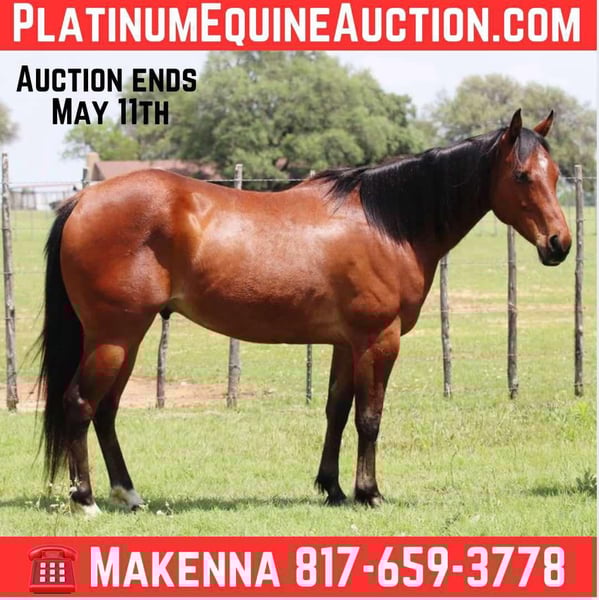 ONLINE AUCTION Place your bids at www.PlatinumEquineAuction.com Starting Bid $3500 Auction ends May 11th, 2025 Need a new saddle? Check out White Rock Saddles on our website or Facebook! Baybay is a super sweet gelding, standing at 14.3hh tall. He is the perfect size and absolutely safe for the whole family! Bay is a great trail horse, point and go type. Crosses over and through anything you ask of him, goes right into water, and can go out alone or in a group! He is so laid back and calm in everything you do with him. Baybay is a puppy dog and doesn’t have a care in the world about anything! Let the kids go have fun on this guy, or just enjoy him for yourself! Bay has plenty of life left in him, at just 9 years old, he will last for many years in to come! He may be wrapped in a not so fun color but his demeanor makes up for it! We absolutely encourage any one to come try and see how great he is for yourselves but we are also able to arrange shipping anywhere from Hawaii to Canada and any state in the U.S. He is located in Lipan Texas Please Call or text Makenna Hartzell 817-659-3778 for more information. ONLINE AUCTION Place your bids at www.PlatinumEquineAuction.com Starting Bid $3500 Auction ends May 11th, 2025 Need a new saddle? Check out White Rock Saddles on our website or Facebook!