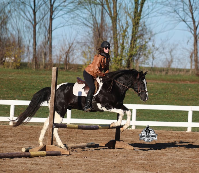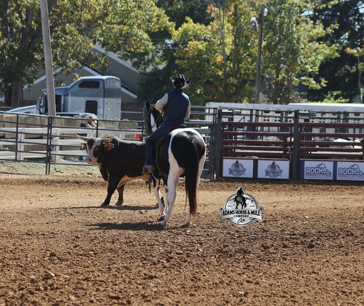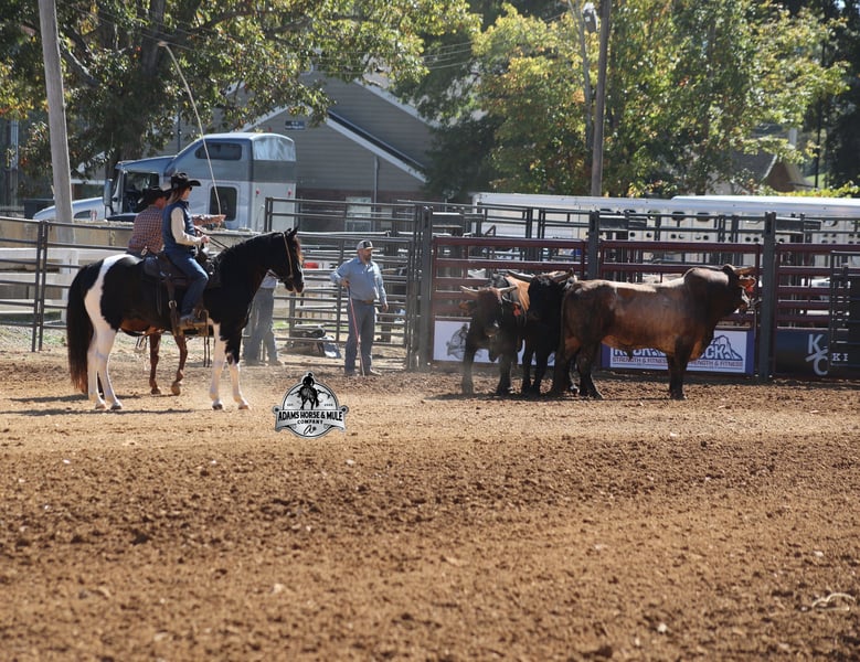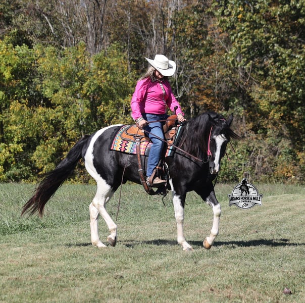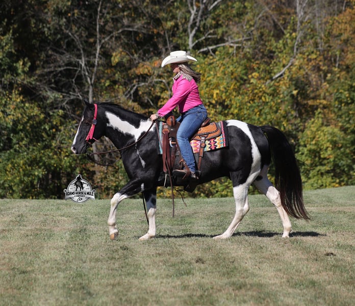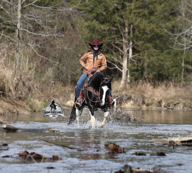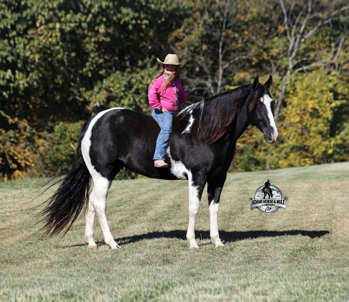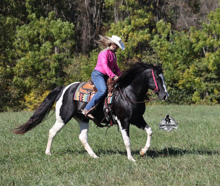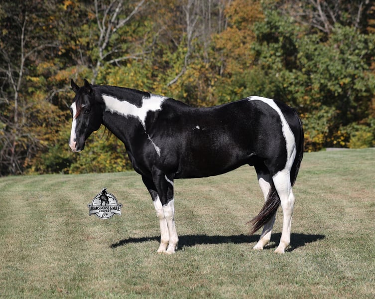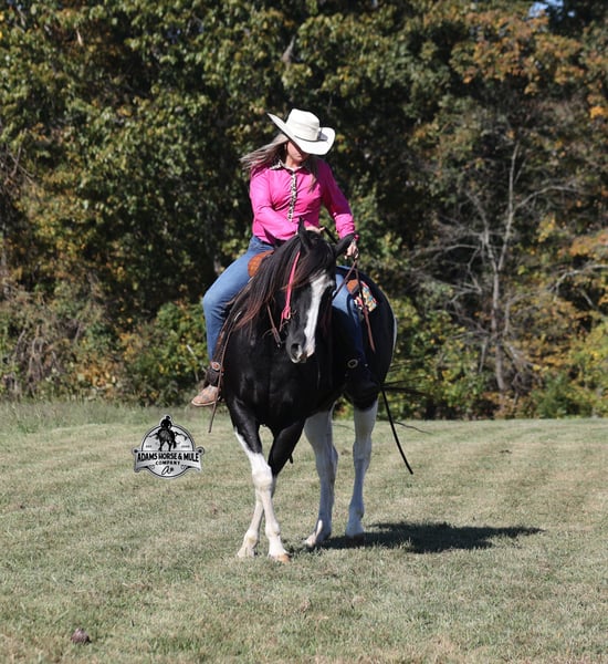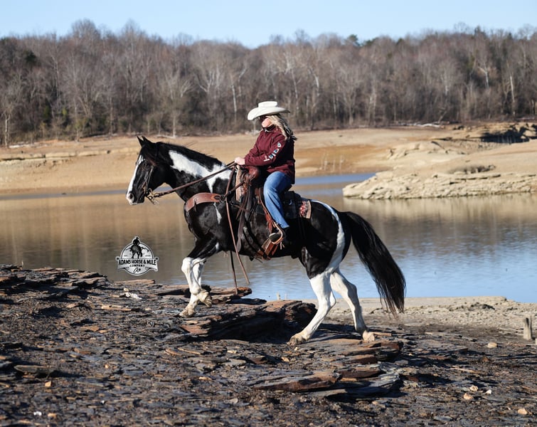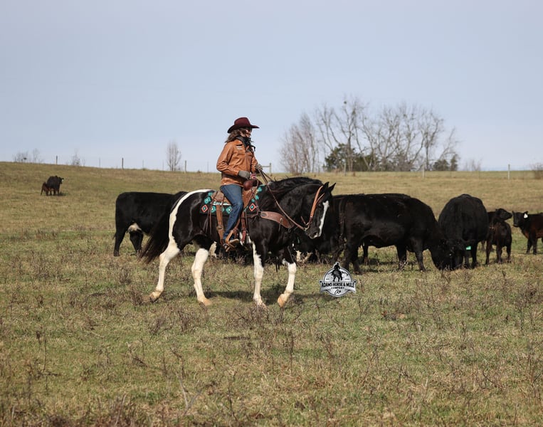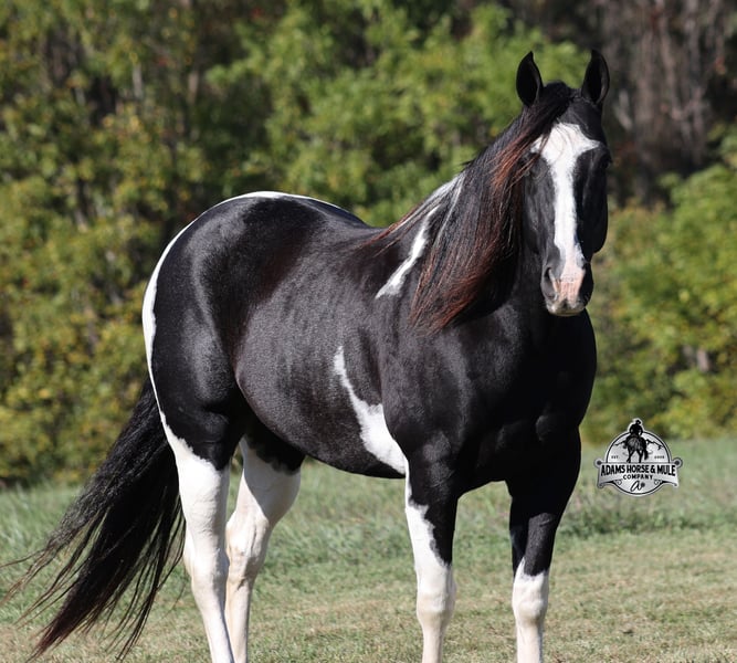 He is consigned to the COWGIRL CADILLACS Sale in Wickenburg, AZ on February 20-21st. You can bid online or bid in person. There is a preview day before the sale or you can come ride him prior to the sale in Mt. Vernon, KY. Register to bid at www.CowgirlCadillacs.com More info at www.AdamsHorseAndMuleCo.com $10000 starting bid Summer Bandit, the only thing that this bandit would steal is a kiss!!! Bandit is a 15.1hh, 2016 model registered American Paint Horse, gelding with beautiful markings, he is stout built with muscles upon muscles with that long flowing mane and tail he belongs on the cover of a magazine… Bandit has been a special horse to us since we started him back in 2019 when he was a 3 year old. We knew from the start that he was a special horse! He was so smart, so friendly and easy going, that training was a breeze! Bandit cruised right through our natural horsemanship program where he learned to ride bridleless, learned to lay down and learned how to set. Since those days Bandit has been trail ridden countless miles. He has been camping and ridden in multiple states surrounding Kentucky, also including Pennsylvania and Missouri. Bandit has been ridden by all ages of beginners, all of our kids and he is totally safe and easy going! He has been ridden around the ranch, penned and sorted cattle. He has been hauled to rodeos, carried the flag for the grand entry, penned and sorted the bulls and our girls used him to give pony rides on where kids and adults lined up to take him for a spin! The lights, speakers, crowds… nothing phases him! Bandit is simple and easy to ride, he has a smooth trot, takes his leads in a smooth easy to set lope and will lope nice circles on a draped rein. He neckreins around, has a good stop, sidepasses to open/shut gates and backs with ease. Bandit has been exposed to all kinds of wildlife and is traffic safe. We have ridden him through town, the drive thru and past Wal-Mart as well. Bandit is great on the trails, as he has carried our kids through rocky terrain, across deep water, up/down slopes and across deadfall. He is not spooky and has been around tarps, wind dancers, bull whips and gun fire. In addition to riding western he has been ridden English and has been over the jumps! Bandit holds steady coming into the jumps and lands balanced. Bandit enjoys grooming time with the kids, where he will get scrubbed down, washed off and braided up, he is Mr. Personality! If you need a safe horse that the whole family can enjoy whether that be around the ranch, on the trails, over the jumps or one to just lay down and take a nap with… Bandit is available to ride and see in Mt. Vernon, KY until the week of the sale Feb. 16-21. Call for more info or if you have any questions 606-308-2461. Go to visit our website for more pics and a video www.AdamsHorseAndMuleCo.com AHAMC has been in the horse business and sold horses over the internet since 2005. We have a long track record of success with hundreds of happy customers. We work hard to match riders with the correct horses and specialize in beginner safe, family friendly horses that have been used and checked out by our family! We can set up transportation anywhere in the US and look forward to working with you. He is consigned to the COWGIRL CADILLACS Sale in Wickenburg, AZ on February 20-21st. You can bid online or bid in person. There is a preview day before the sale or you can come ride him prior to the sale in Mt. Vernon, KY. Register to bid at www.CowgirlCadillacs.com More info at www.AdamsHorseAndMuleCo.com $10000 starting bid