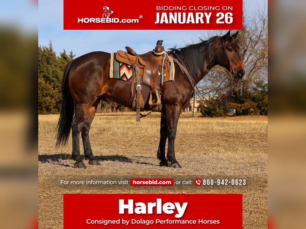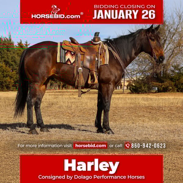 𝐉𝐀𝐍𝐔𝐀𝐑𝐘 ⭐️𝑨𝒍𝒍 𝑺𝒕𝒂𝒓 𝑳𝒊𝒏𝒆𝒖𝒑⭐️ Happening now thru MONDAY | JANUARY 26th - Available EXCLUSIVELY on HorseBid's website! For more details and to register visit: www.Horsebid.com CONSIGNOR CONTACT: Dolago Performance Horses 860-942-0623 LOCATION: Ripley, OK BREED: AQHA REGISTERED: Yes REGISTERED NAME: ROUGH CUT PINE LINK COLOR: Bay HEIGHT: 15 AGE: 10 GENDER: Gelding Harley is a 10 year old big, stout, SHAPEY brown gelding with phenomenal confirmation. He will catch your eye anywhere. He is 100% sound and gentle. This is one solid all around package deal with the look to get anyone’s attention. He has spent a significant amount of time in the feedyard and is no stranger to a long, hard day of work on the ranch. He has been roped off many times and used to doctor just as many times. With that foundation and usage he is showing tons of potential to be a rope horse! Harley is built on generations of Two Eyed Jack and Poco Bueno blood breeding known for producing horses with bone, brains, and longevity. He carries Two Eyed Jack right on his papers, and his conformation and mind reflect it to a T.