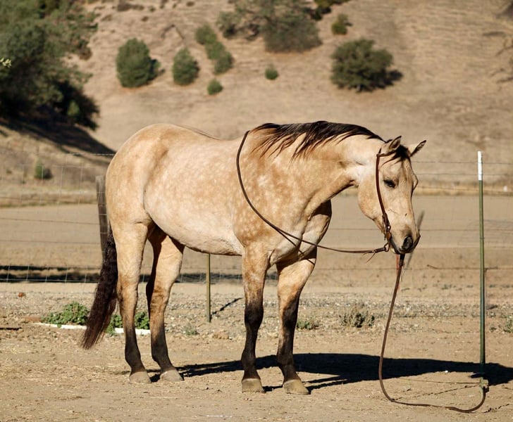 ONLINE AUCTION Place your bids at www.PlatinumEquineAuction.com Starting Bid $3500 Auction ends November 16th, 2025 Need a new saddle? Check out White Rock Saddles on our website or Facebook Amaretto – The Dapple Buckskin Gentleman with a Willing Heart Beautiful, well-made, and all class — this dapple buckskin gentleman has the looks, shape, and attitude that’ll make you tip your hat every time you walk past him. Amaretto is a 10-year-old, 15-hand gelding that’s spent most of his life as a trail and ranch horse. He’s covered miles of country, gathered cattle, and checked fences across all kinds of terrain. He’ll go through brush, cross creeks, climb hills, and handle traffic or ranch commotion without a care in the world. He’s surefooted, steady, and the kind of horse you can count on to get you there and back in one piece. Since coming to Longhorn Ranch, we’ve been riding him in the arena and introducing him to flags, obstacles, and new situations — and he’s doing great with all of it. He takes everything you show him with that “no big deal” attitude, always willing to try and eager to please. He’s learning quick, staying soft and relaxed, and proving that he’s not just a good trail horse — he’s a versatile one, too. He picks up both leads, moves off your leg, and stays light in the bridle. He’s smooth, balanced, and easy to get along with — the kind that makes every ride feel simple and enjoyable. He’s not the showy or complicated type; he’s the kind that makes you appreciate the good ones that just get along and go anywhere. Amaretto is good to shoe, haul, bathe, and tie, and he’s the kind that meets you at the gate with a soft eye and a kind heart. He’s pleasant in the barn, easy in a group, and steady out on his own. If you’re looking for one that’s easy on the eyes, comfortable to ride, and good-minded through and through, this buckskin fits the bill. He’s got that steady foundation, a lot of life ahead of him, and a personality that makes him a favorite wherever he goes. Whether you’re cruising the trails, checking cattle, or just want a solid partner to enjoy every day — Amaretto’s the one for You . 📍 Located at Longhorn Ranch – Paicines, California 📞 Contact Dina: 831-537-1915 🚚 Nationwide shipping available ONLINE AUCTION Place your bids at www.PlatinumEquineAuction.com Starting Bid $3500 Auction ends November 16th, 2025 Need a new saddle? Check out White Rock Saddles on our website or Facebook