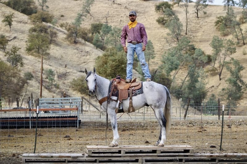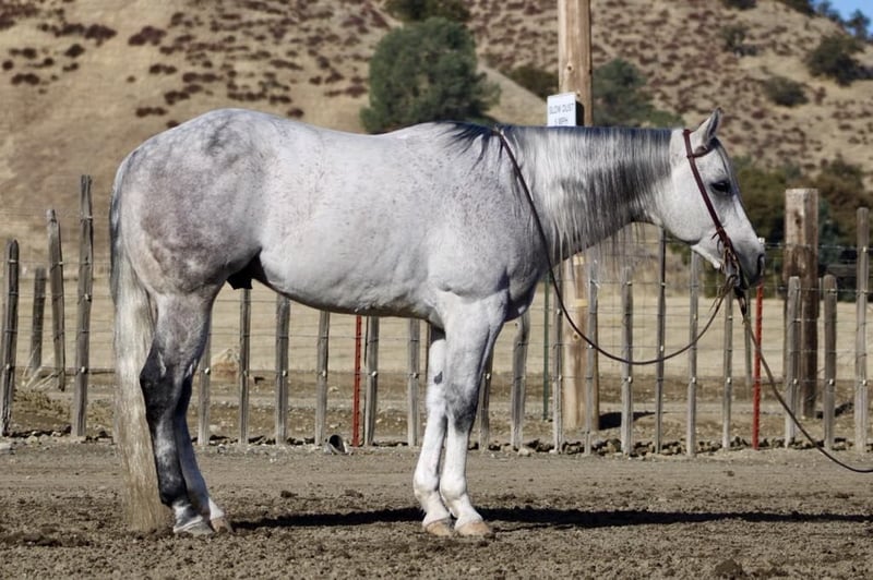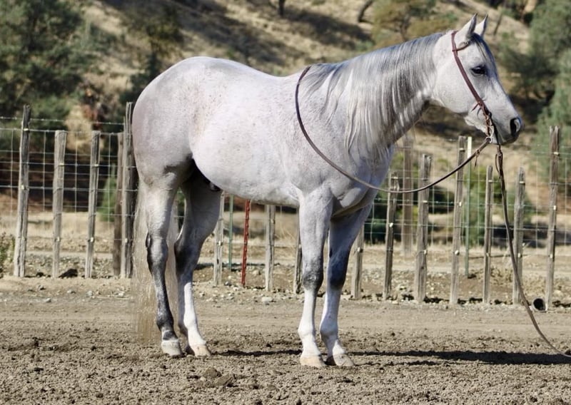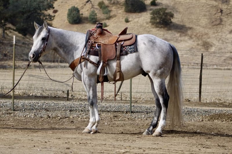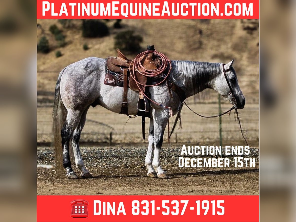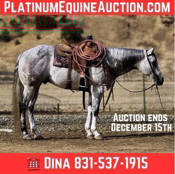 NLINE AUCTION Place your bids at www.PlatinumEquineAuction.com Starting Bid $3500 Auction ends December 15th, 2024 Need a new saddle? Check out White Rock Saddles on our website or Facebook! If you’re dreaming of a Christmas surprise that sparkles brighter than any ornament under the tree, look no further than Boots, our stunning grey gelding! Imagine unwrapping the gift of this magnificent creature on Christmas morning. With his sleek, beautiful grey coat long main and tail and three striking white socks, Boots stands proudly at 15 hands tall and is a delightful 8 years old. He’s more than just a pretty face; he’s an absolute sweetheart with a gentle nature that makes him perfect for riders of all ages from curious children to seasoned adults. This charming fellow is not only safe but incredibly reliable; whether you want to gallop through pastures or leisurely stroll down trails, with friends or out solo. Boots will follow your lead with his kind demeanor. Having spent countless days working on the ranch branding cattle and checking herds he’s proven himself time and again as dependable in various terrains. Not even wildlife can distract him as he confidently crosses rivers and navigates logs like it’s second nature! Whether you’re taking him to busy streets or serene beaches, he remains unfazed by the hustle and bustle around him. When it comes to arena work? Well, Boots excels there too! His smooth transitions between gaits are complemented by an easy one-hand neck rein that makes riding feel effortless.Boots has nice turn around and smooth stop with a soft supple back up. He’s tackled obstacle courses like a pro without flinching at tarps or bouncy balls; he’s truly got nerves of steel wrapped in sweetness. Handling him is as easy as pie.Boots is easy to clip,tie,bathe and has zero bad habits. He handles time off well pastures or stalls great and is just an absolute gentlemen to be around. Boots is one that you can always count on to be safe, reliable and very laid back at all times. Boots will be the apple of your eye for years to come. Shipping is available. Please contact Longhorn Ranch Dina @831-537-1915 located in Paicines, CA. ONLINE AUCTION Place your bids at www.PlatinumEquineAuction.com Starting Bid $3500 Auction ends December 15th, 2024 Need a new saddle? Check out White Rock Saddles on our website or Facebook!