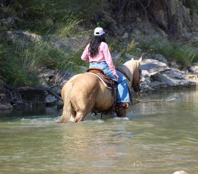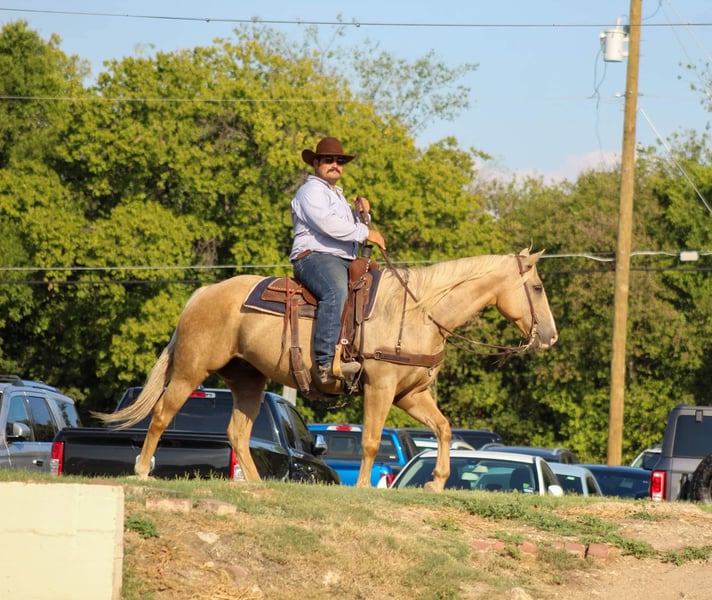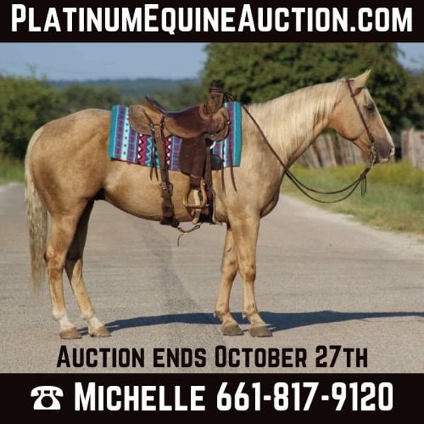 ONLINE AUCTION Place your bids at www.PlatinumEquineAuction.com Starting Bid $3500 Auction ends October 27th, 2024 Need a new saddle? Check out White Rock Saddles on our website or Facebook! Everyone STOP there scroll and check out this GORGEOUS guy!!! Ken is a golden palomino gelding and the PRIME age of just 8 years old with his WHOLE life ahead of him . He stands 15hds tall. Ken has dabbled in just a little bit of everything . They say blondes have more fun and I can promise, you will have fun riding this guy plus he gets all the looks when out on the town because he’s just that gorgeous shiny golden color that gets everyone’s attention. Ken rode right down the famous bricks of Exchange Ave at the historical Forth Worth Stockyards with zero issues at all , with 100’s of people everywhere he was completely unbothered by them , along with carriages , heavy traffic and loud music he rode right down through it all like a seasoned veteran on a Saturday night . If riding in town isn’t your thing don’t worry he will ride out just the same from the grasslands to the mountains. He will cross water with zero hesitation, cross logs , bridges , and tarps . He has also been rode in thick brush out checking cows and fences. He is absolutely user friendly and you don’t have to be a cowboy to ride him . He’s an easy enjoyable ride. In the arena Ken will walk , trot and lope nice easy circles . This fancy boy is super sweet and a laid back type of dude . He can be stalled or turned out in a herd . He is currently out in a herd setting and is easy to catch with no drama . He ties , stands for the farrier . He trailers great also . Contact us to come try him, or we can set up a FaceTime also . If you need help with transport don’t hesitate to ask we have a list of reputable haulers that can get him safely to your doorstep world wide. Located in Stephenville, TX. Contact M$ Performance Horses Michelle 661-817-9120. ONLINE AUCTION Place your bids at www.PlatinumEquineAuction.com Starting Bid $3500 Auction ends October 27th, 2024 Need a new saddle? Check out White Rock Saddles on our website or Facebook!