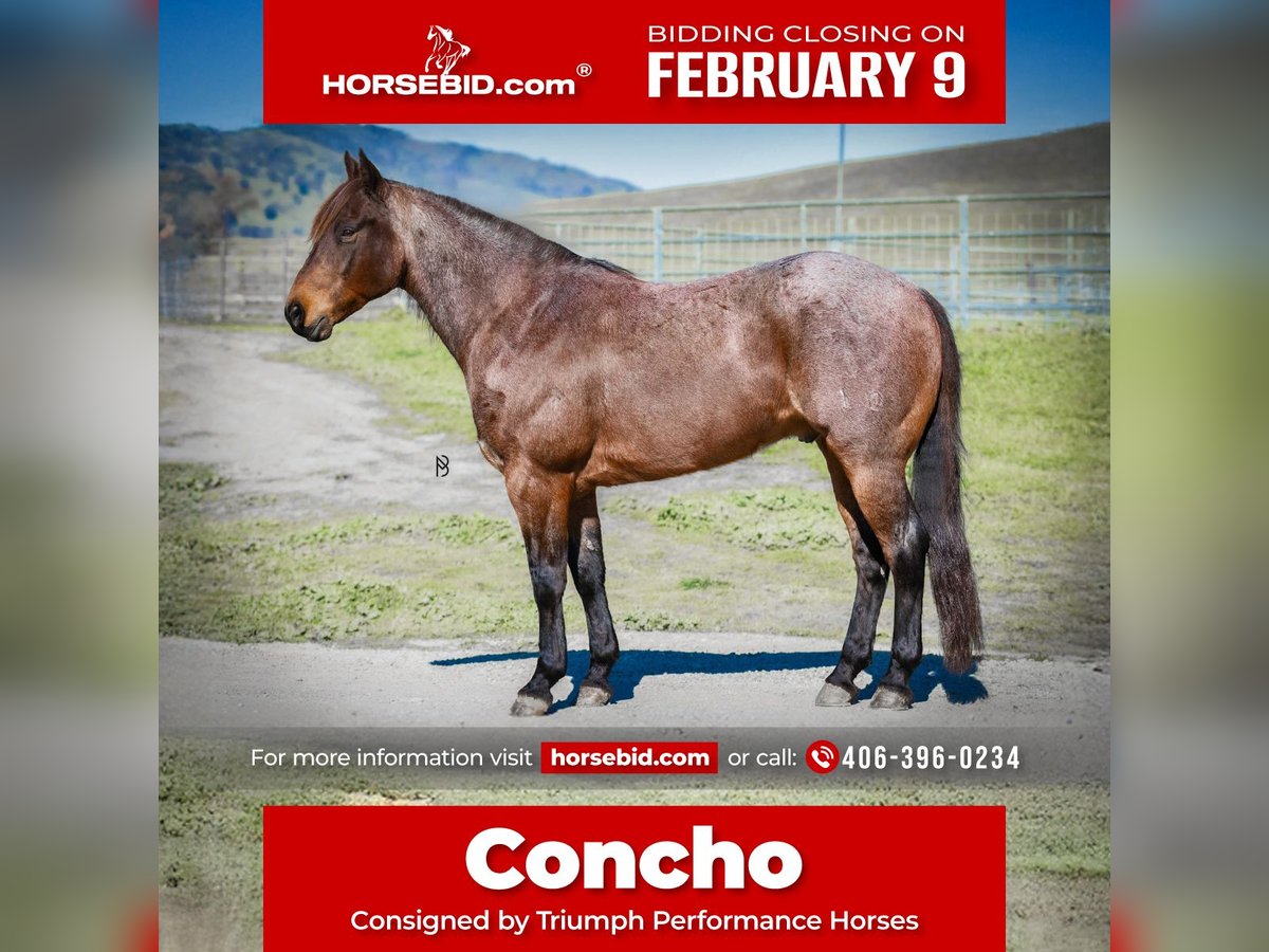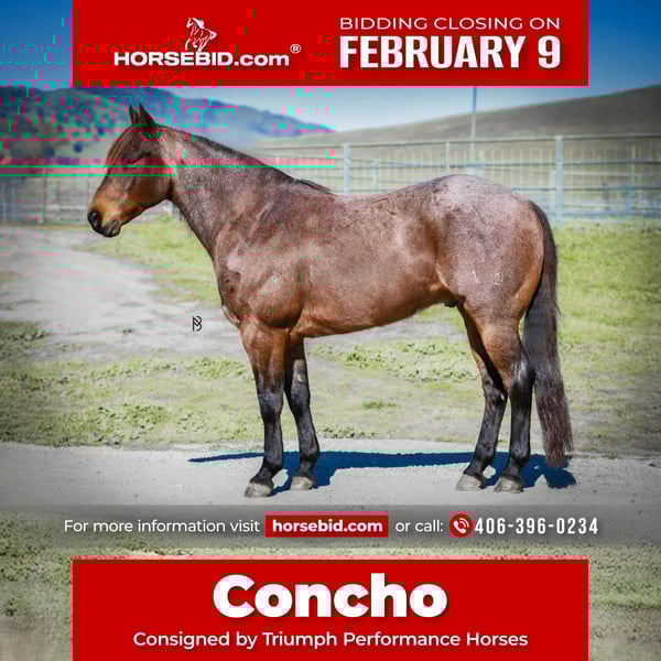 ❤️🔥𝑩𝒆 𝑴𝒊𝒏𝒆 𝐒𝐄𝐋𝐄𝐂𝐓❤️🔥 Happening now thru MONDAY | FEBRUARY 9th - Available EXCLUSIVELY on HorseBid's website! For more details and to register visit: www.Horsebid.com CONSIGNOR CONTACT: Triumph Performance Horses (406) 396-0234 LOCATION: Lincoln, CA BREED: AQHA REGISTERED: Yes REGISTERED NAME: Hancock Concho Straw COLOR: Bay Roan HEIGHT: 15 AGE: 10 GENDER: Gelding If you’re looking for a been-there, done-that, no-nonsense gelding that can truly do it all, Concho checks every box. Standing a solid 15 hands with a big hip, solid bone, plenty of substance, and a work ethic that’s getting harder to find, Concho is the definition of seasoned and dependable. Concho ropes both ends in the team roping, has been used extensively in breakaway, and also has a solid barrel pattern. He has been hauled all over and has won money at numerous World Series Roping's, U.S. Roping's, and The Patriot on the heel side. Concho has been heeled on successfully by riders ranging from a #3 all the way to a #8 heeler. In the breakaway pen, he has won money and multiple buckles, making him a true multi-event horse. Outside the arena, Concho is just as solid and experienced. He has been ridden countless miles on the trail — through water, over deadfall, across large bridges over canyons, and down the road around traffic without hesitation. He is excellent to pony other horses off of and remains sensible in new environments. He is well broke with a snappy one-handed neck rein, nice turnarounds, a ground-covering extended trot, side passes, and is responsive to leg pressure. He can sit with extended time off and come back to work without any silly business. While Concho has packed youth riders, he is not a total beginner horse. When you swing a leg over, he is all business — forward, responsive, and ready to work. A beginner rider without guidance may find him intimidating, but he is a capable partner that is ready to go get a job done. Concho is 100% sound with no history of issues and has zero bad habits — no buck, rear, bite, bolt, or kick. On the ground, he is a complete gentleman: respectful, uncomplicated, and easy. He loads in the trailer with a point in the right direction, backs out quietly, travels well, stands tied without a fuss, saddles and bridles easily, and will never cause drama at the trailer — even when the annoying young baby is chewing on his halter. PPEs are welcome and encouraged, and buyers are invited to come try him in person in Lincoln, CA. Please don’t hesitate to reach out with any questions or requests — we are committed to finding the perfect fit for this outstanding horse.