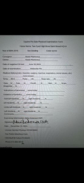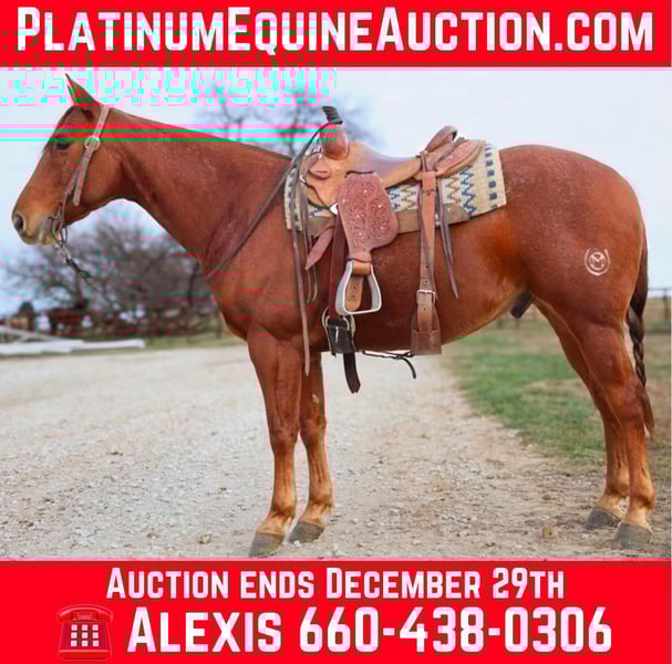 ONLINE AUCTION Place your bids at www.PlatinumEquineAuction.com Starting Bid $3500 Auction ends December 29th, 2024 Need a new saddle? Check out White Rock Saddles on our website or Facebook! Two Eyed High Brow aka Frosty is a 2016 model registered AQHA gelding who embodies the spirit of a true ranch horse. He is a very well bred horse being a grandson of High Brow Cat and going ack to Two Eyed Jack on the bottom side. Frosty is a true gem in every sense! This sweet and affectionate horse loves attention and is always eager to please. He’s not just a pretty face; he’s a hardworking ranch and working horse with a fancy one-hand ride that’s smooth and responsive. Whether you’re working cattle or enjoying a long trail ride, this gelding has the stamina to go all day long. He’s the perfect combination of charm and capability, making him a wonderful addition to any ranch or riding program. Don’t miss out on this exceptional horse! Standing 15HH, big boned and big footed. Frosty is always ready to tackle a hard day’s work with unwavering determination and no quit. Whether it’s herding cattle, mending fences, or any other ranch task, Frosty brings reliability and a strong work ethic to every job. His experience and steady temperament make him an invaluable partner on the ranch, ensuring that every day is productive and efficient. If you’re looking for a dependable and hardworking horse, Frosty is the perfect fit for all your needs. Selling 100% sound. Call Alexis Mantonya 660-438 0306 with any questions. Located in Warsaw, MO. ONLINE AUCTION Place your bids at www.PlatinumEquineAuction.com Starting Bid $3500 Auction ends December 29th, 2024 Need a new saddle? Check out White Rock Saddles on our website or Facebook!