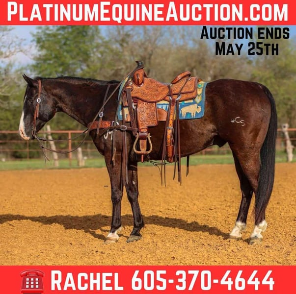 ONLINE AUCTION Place your bids at www.PlatinumEquineAuction.com Starting Bid $3500 Auction ends May 25th, 2025 Need a new saddle? Check out White Rock Saddles on our website or Facebook! Headlight In Smoke is a 9 year old AQHA black gelding, He is by a son of Yellow Roan Of Texas (LTE $73,000) And Sires over $500,000 of earners! Smoke stands 15.1 hands tall. Smoke is a solid gelding that is a fun horse to ride, he lopes around very smooth and collected, keeps his head right in between the bridle like a broke horse should, loaded with cow sense and a very fun horse to sort pairs with. Smoke is great to ride outside goes anywhere you point him and crossed over all the obstacles in front of him. He has been used for all aspects of ranch work, and is broke for the whole family! Smoke has been hauled to the shows and has been shown in ranch riding and ranch trail classes. This is a super talented and fun gelding that you won’t want to miss out on! He is located in Rusk TX, nationwide shipping is available. Call or text TR Livestock Rachel 605-370-4644 for more info! ONLINE AUCTION Place your bids at www.PlatinumEquineAuction.com Starting Bid $3500 Auction ends May 25th, 2025 Need a new saddle? Check out White Rock Saddles on our website or Facebook!