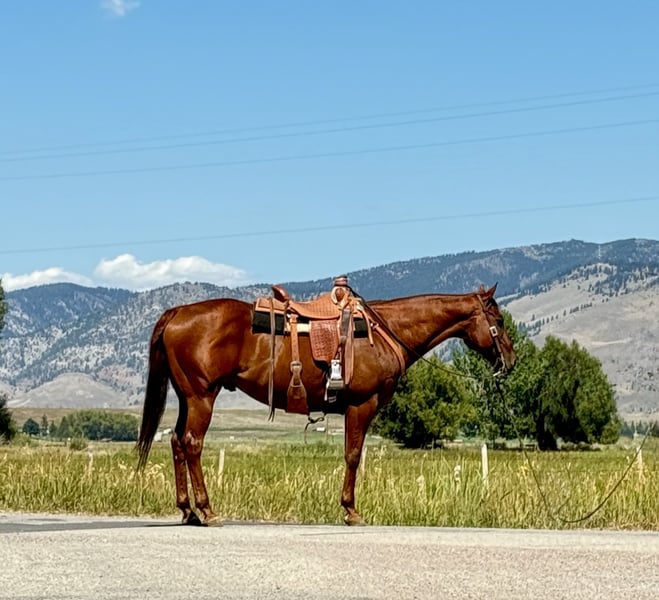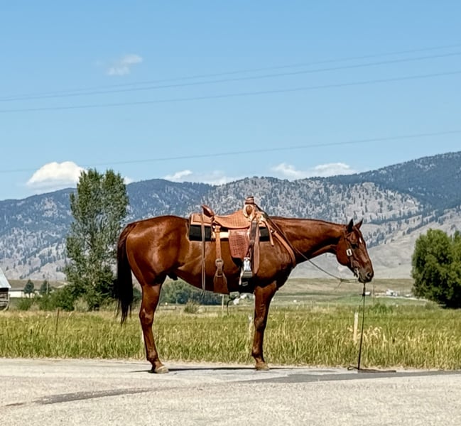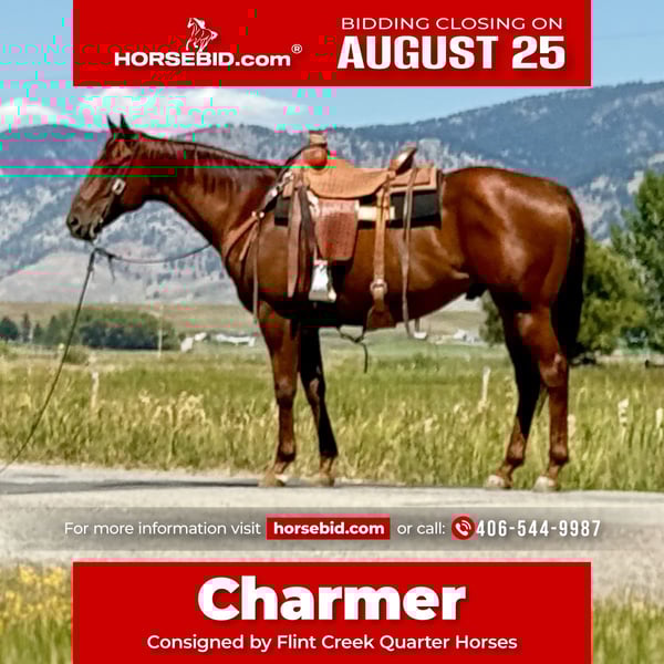 ⭐️ 𝐀𝐔𝐆𝐔𝐒𝐓 𝓐𝓵𝓵 𝓢𝓽𝓪𝓻 𝓛𝓲𝓷𝓮𝓾𝓹 ⭐️ Happening now thru MONDAY | AUGUST 25th - Available EXCLUSIVELY on HorseBid's website! For more details and to register visit: www.Horsebid.com CONSIGNOR CONTACT: Flint Creek Quarter Horses 406-544-9987 LOCATION: Drummond MT BREED: Quarter Horse REGISTERED: Yes REGISTERED NAME: Special Red Charmer COLOR: Sorrel HEIGHT: 15.2 AGE: 10 GENDER: Gelding Charmer is an AQHA registered Gelding that stands just under 15.2 hands. This is one for the whole family. Everything about this guy is gentle gentle. He is an experienced ranch horse that has been used for all aspects of ranch work including dragging calves to the branding fire and roping in the pasture. Been used to push and gather cattle in the mountain pastures and is surefooted and will go all day. He is a veteran trail horse as well and has logged many miles prowling the mountain trails and crosses all the different obstacles with ease. He has been ridden by Kids that know how to ride and takes good care of his passengers. He’s the kind you can lay off for months at a time and just go catch him, saddle him up and go, and he will saddle up gentle and ready to go to work every time. He is very easy to catch And stands like a gentleman for the Farrier. Easy to haul and bath. You can lead him up to any mounting block or step and simply Smooch to him and he will sidestep over and let you get on. This is a very kind hearted guy that has done a little bit of everything. He has also been used as a team roping horse heading and heeling steers in the arena. Stands quiet in the box and scores well. He is very fast and will gather one up quickly. This is a really nice horse that anyone that knows how to ride will get along with. We have used him as a lesson horse for novice riders and have used him on trail rides putting our less experienced riders on him. He has a good one hand neck rein on him and will side pass to open and close gates. He is 100% sound and has no lumps or bumps or blemishes. He is a good looking well bred guy in the prime of his life. He has a good fast walk outside and is smooth to ride. Has never bucked or pulled back. He is the kind you can go get a hard job done and then throw your grandbabies up in the saddle with you and he will just ease around. Feel free to give us a call and come and try him at the ranch. Call or text Tom for more info. 406-544-9987.