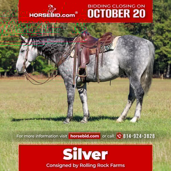 ♦️ 𝐭𝐡𝐞 𝐀𝐌𝐄𝐑𝐈𝐂𝐀𝐍 𝓕𝓪𝓵𝓵 𝓒𝓵𝓪𝓼𝓼𝓲𝓬 ♦️ Happening now thru MONDAY | OCTOBER 20th - Available EXCLUSIVELY on HorseBid's website! For more details and to register visit: www.Horsebid.com CONSIGNOR CONTACT: Rolling rock farms 814-924-3828 LOCATION: Miola, PA BREED: Quarter horse REGISTERED: Yes REGISTERED NAME: SPOOKS SILVER LOWRY COLOR: Grey HEIGHT: 15.3 AGE: 9 GENDER: Gelding Silver is a registered AQHA gelding that checks every box, he’s as beautiful as he is broke. This stunning 9 year old dapple grey stands 15.3 hands tall and is thick made with all the right shape. He’s truly the kind that turns heads wherever you take him, with a kind eye and a quiet, willing attitude to match. In the arena, Silver rides around the very best. He’s soft in the bridle, has an easy headset, and moves off your leg with a true one hand neck rein. His trot and lope are both smooth and comfortable, making him a joy to ride for any level of rider. He has a nice big stop, a correct back up, and takes everything you ask of him. Silver is a super gentle, good-minded gelding that stays consistent and quiet whether he’s ridden every day or pulled out once a week. Nothing seems to bother him, he doesn’t spook easily and always aims to please. Out on the trail, Silver is a seasoned citizen and the kind you can trust to go anywhere. He’s a point and go type who will willingly cross water, step over logs, and handle any terrain you point him at. He’s been exposed to dogs, goats, chickens, and farm equipment, and never bats an eye. He stands perfectly to be tacked, bathed, and mounted, and he’s great in cross ties. Whether he’s kept in a stall or turned out in the pasture, he’s easy to catch and happy to see you. He is lower to middle in the pecking order. Silver has had a rope swung off him, has sorted cattle, and even goes nicely in English tack. He’s a versatile gelding that could easily go in any direction, ranch, trail, or all around family horse. With his steady mind, smooth ride, and beautiful dappled coat, he’s the kind everyone looks for but few ever find. Silver is the complete package. Gentle, broke, and absolutely gorgeous. He loads in the trailer perfectly and hauls quietly. He does good with time off and will ride off the same every time. he is selling with a negative coggins, a rabies vaccination and 4 shoes. If you would like to check out silver or have any questions please feel free to contact Ethan Shultz at (814) 924-3828
